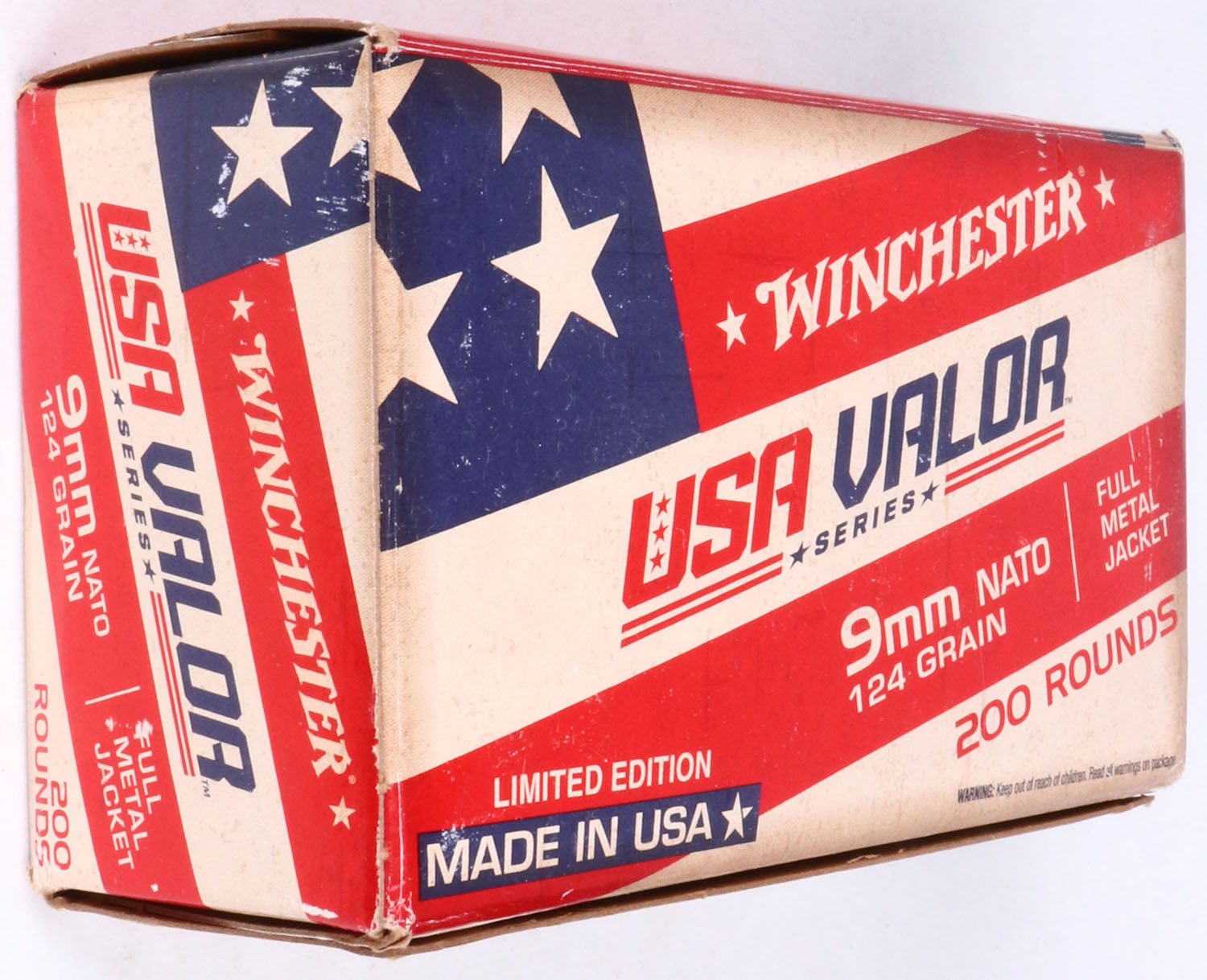 Winchester, USA Valor, 9mm Nato, 124 Gr. FMJ Bullet, 1pc, FULL & SEALED, red/white/blue box, box is solid with minor age soiling, & wear. Grade: Excellent - Value: 50 to 150