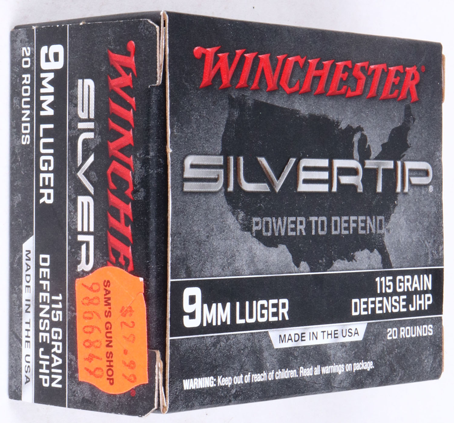 Winchester, Silvertip, 9mm Luger, 9115 Gr. Defense JHP bullet, 1pc, Full, black box with silver/red label & red/white print, box is solid with light wear, ammo is excellent. Grade: Excellent - Value: 20 to 60