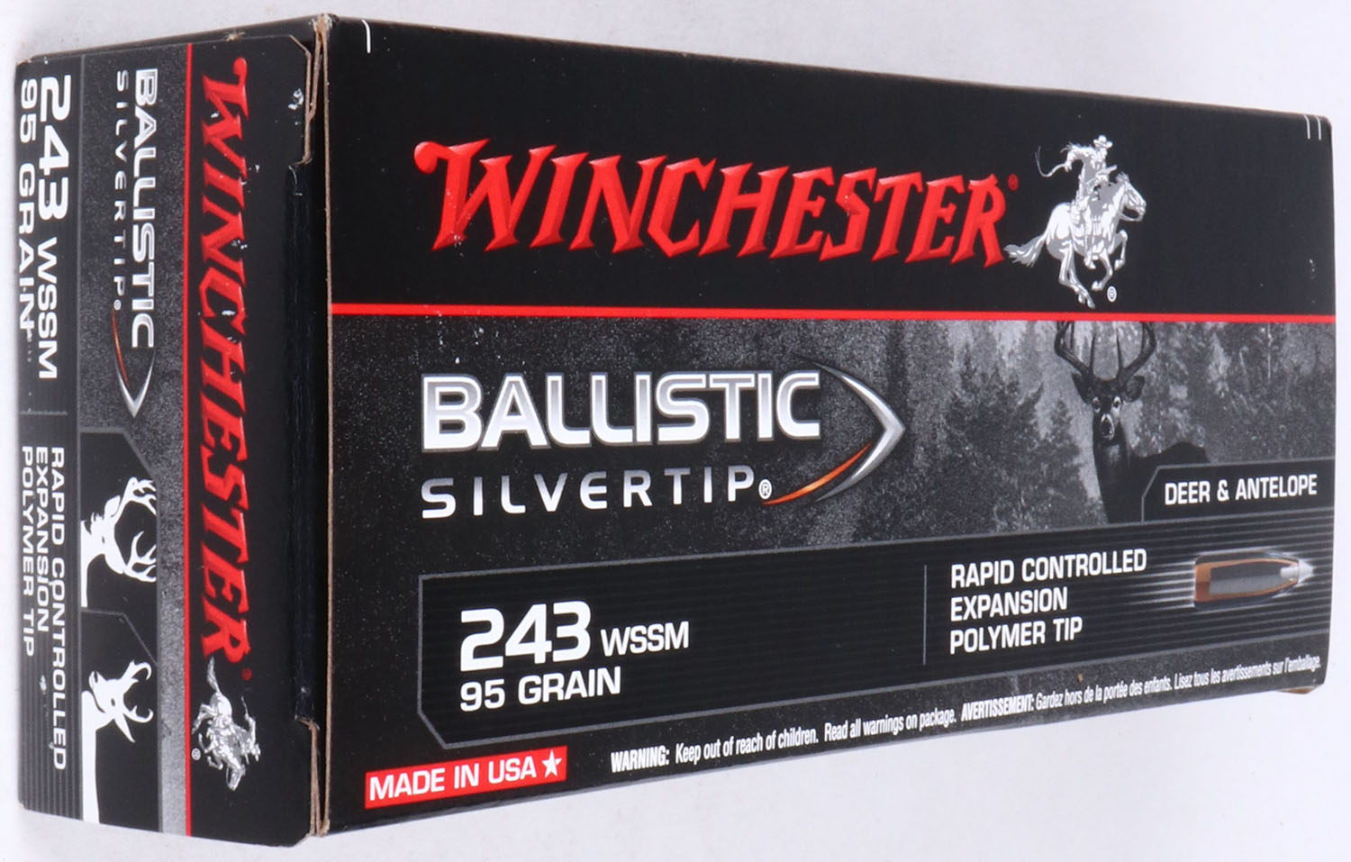 Winchester, Silvertip, .243 WSSM, 95 Gr. Rapid controlled expansion polymer tip bullet, 1pc, Full, black box with white/red label & red/white print, box is solid with light wear, ammo is excellent. Grade: Excellent - Value: 30 to 90