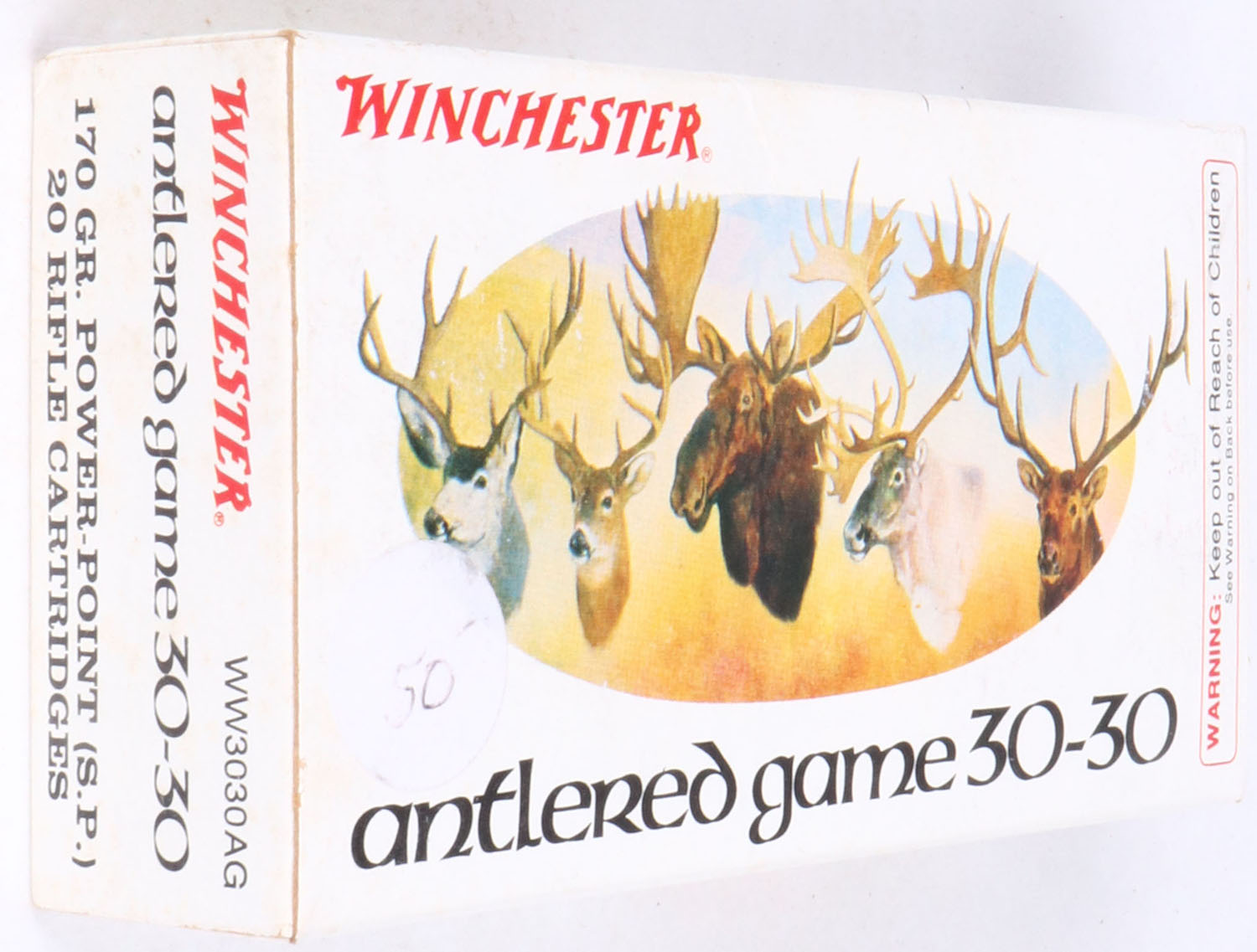 Winchester, Antlered Game, 30-30, 170 Grain Power Point SP, Full, 1pc., Multi-colored box, box is solid but has light edge wear with great color, Ammo is excellent. Grade: Excellent + - Value: 40 to 80