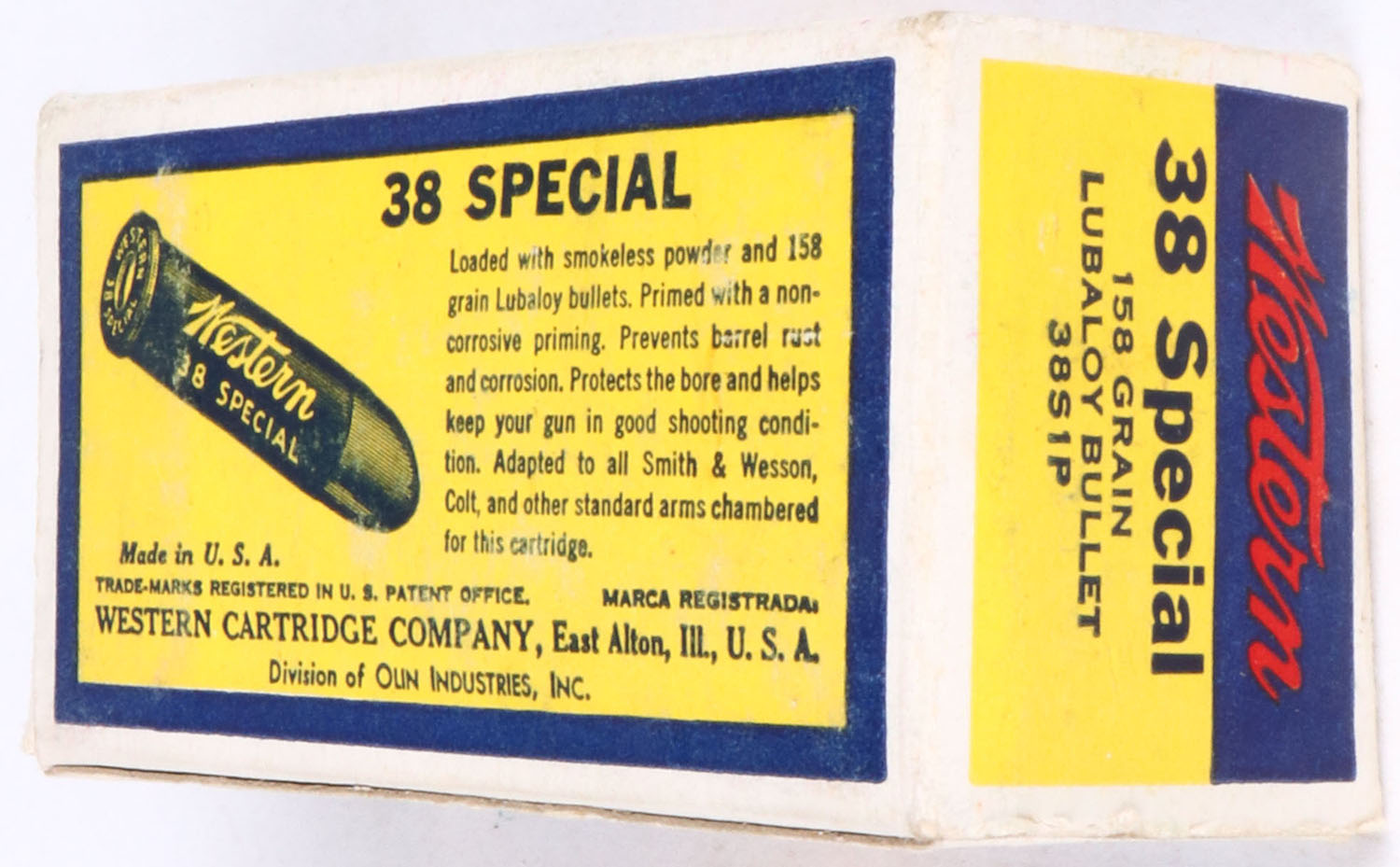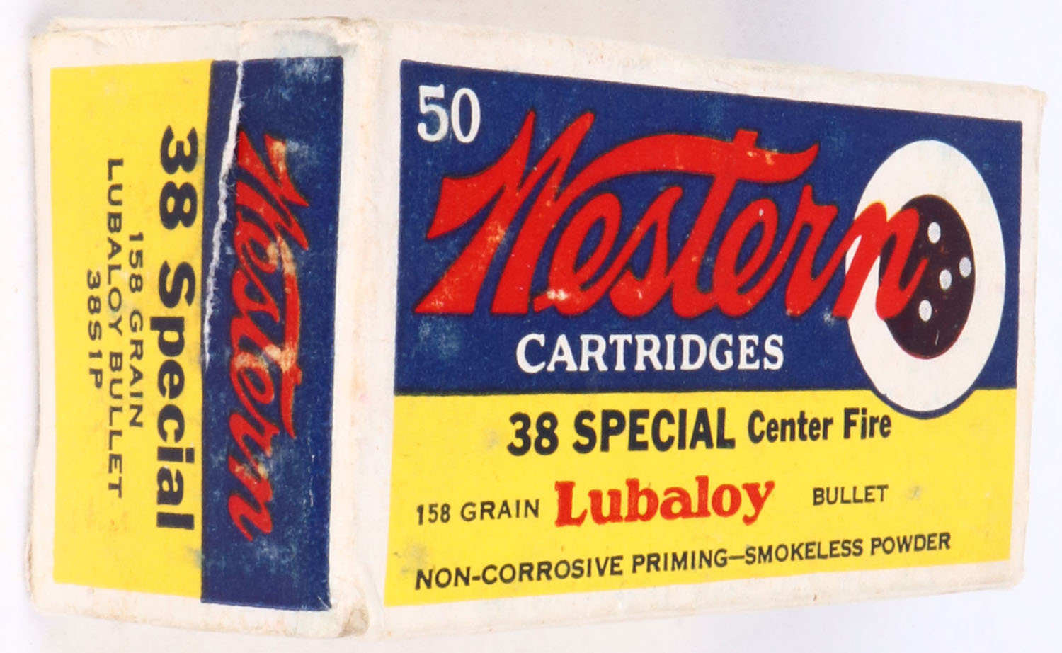 Western, Bullseye, .38 Special, 158 Gr. Lubaloy bullet, 1pc, Full, buff box with yellow/blue label & black/red/white print, box is solid with excellent color, tear on left end flap, light rub marks & light edge wear, ammo is excellent. Grade: Excellent - Value: 50 to 100