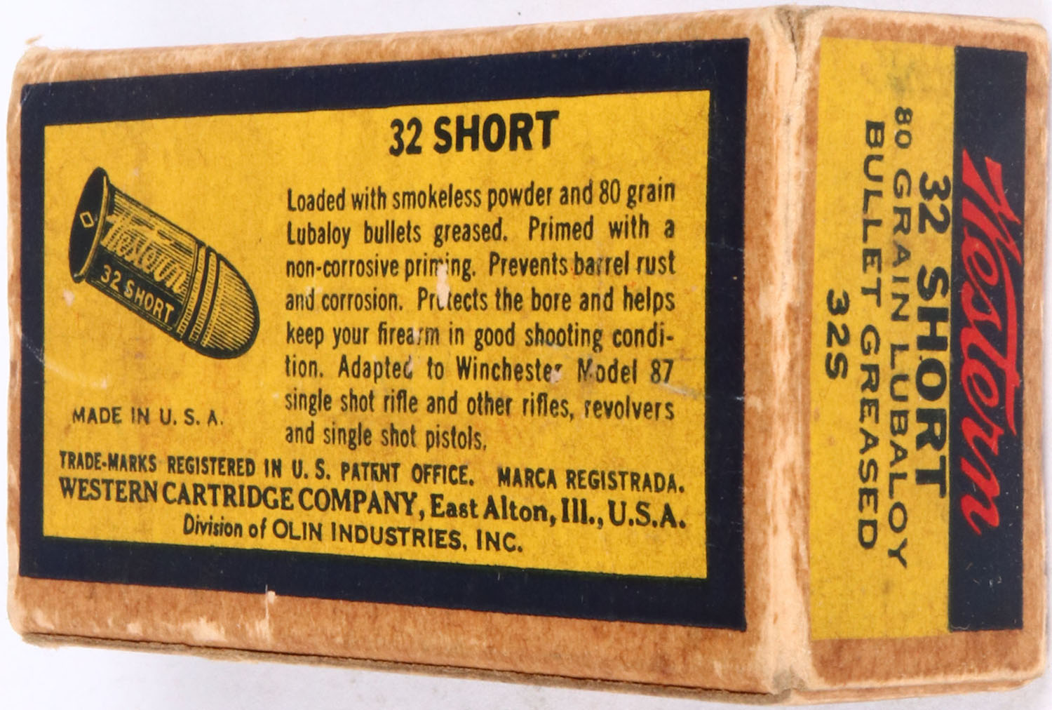 Western, Bullseye, .32 short, 80 Gr. Lubaloy Greased bullet, 1pc, Partial 30 Rds., buff box with yellow/blue label & black/red/white print, box is missing left end flap. minor age soiling, light rub marks, & edge wear, ammo is very good. Grade: Very Good + - Value: 30 to 60