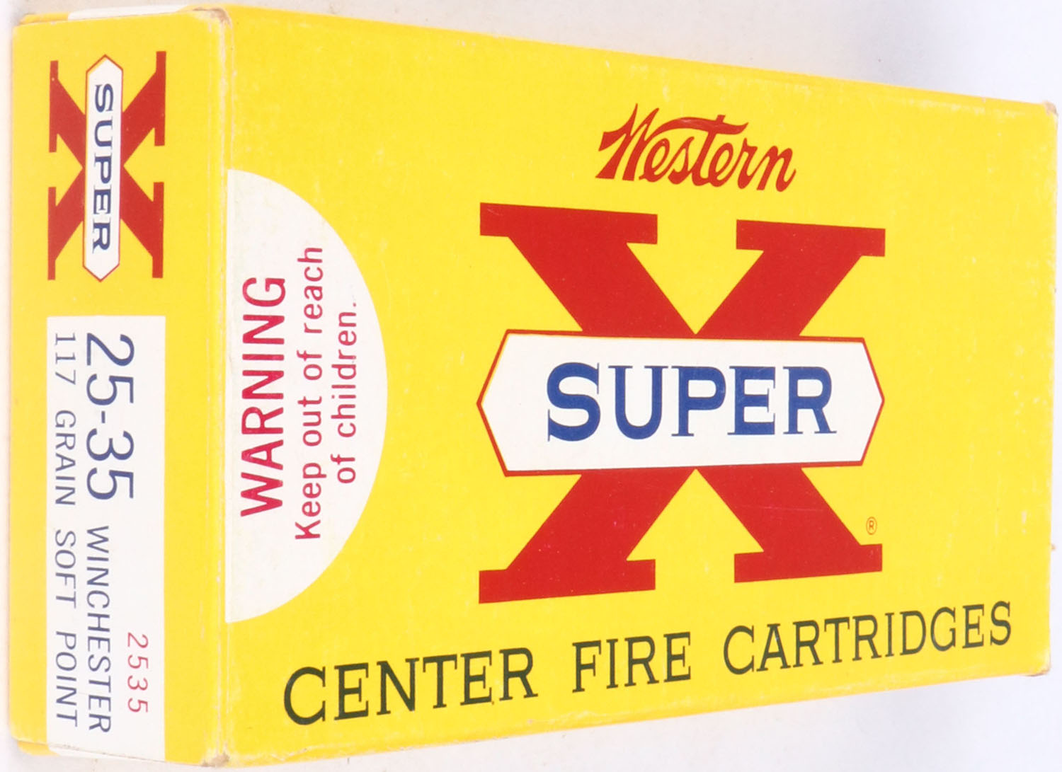 Western, Super-X, .25-35 Winchester, 117 Gr. Soft point bullet, 1pc, Full, yellow box with white label & red/black print, box is solid with rub marks, & light edge wear, ammo is excellent. Grade: Excellent - Value: 50 to 150
