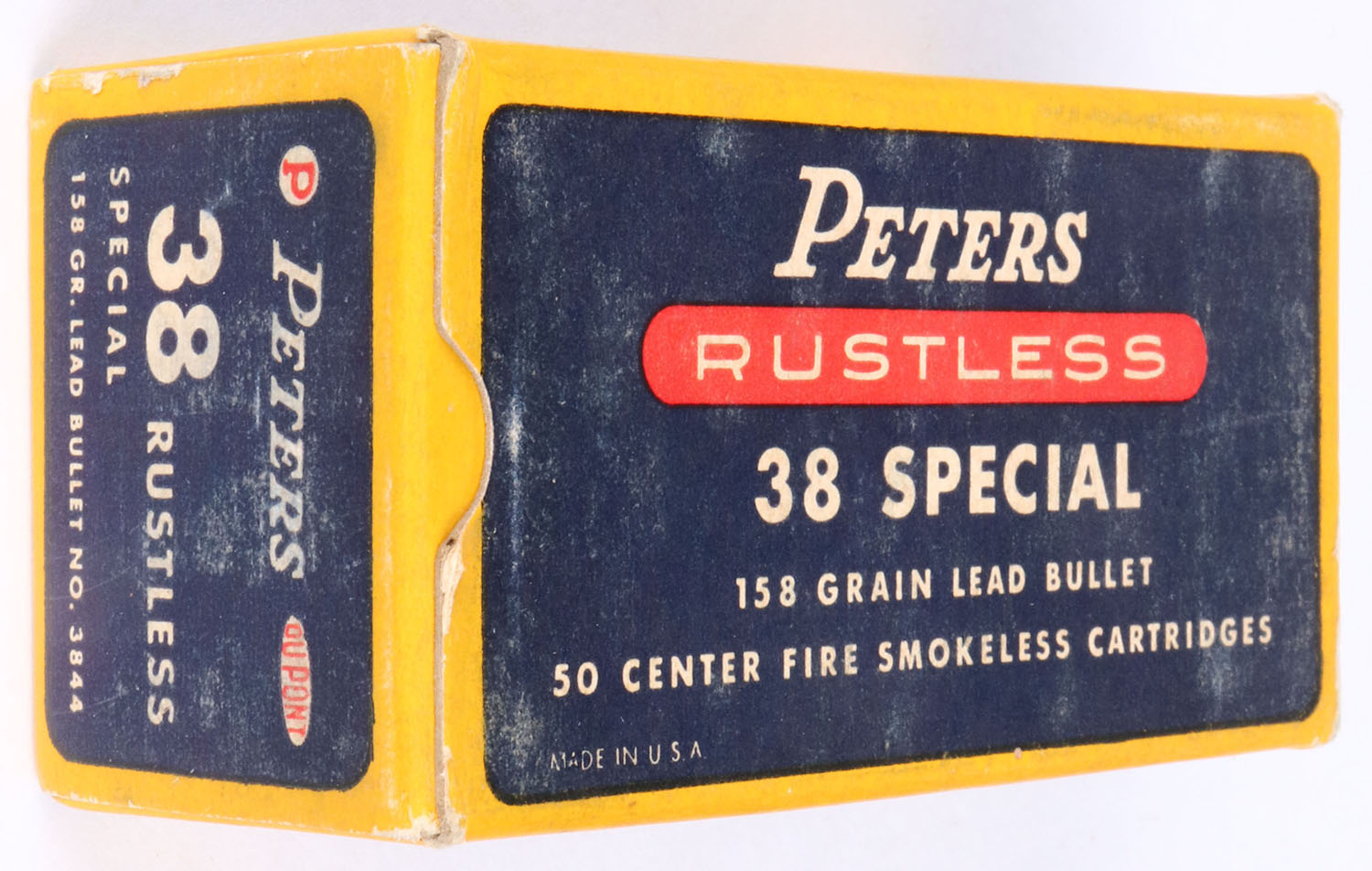 Peters, Rustless, .38 Special, 158 Gr. Lead Bullet, 1pc, Full, yellow box with blue/red label & white/black print, box is solid with light rub marks, & light edge wear, ammo is excellent. Grade: Excellent - Value: 40 to 80