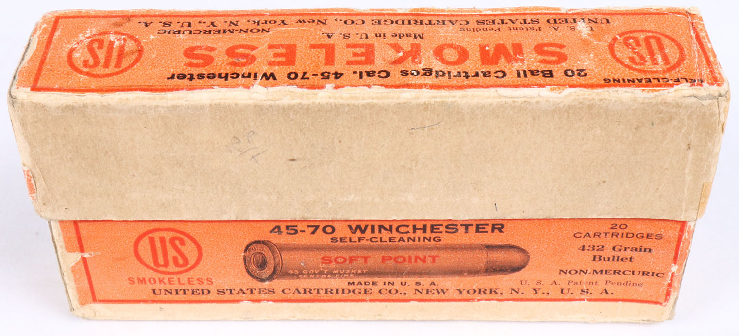 U.S. Cart. Co., .45-70 Winchester, Smokeless, Self-Cleaning, 432 Gr. Soft Point bullet, 2pc, Full, buff box with orange/red label & black print, box is missing right end of lid with tape cover,, light rub marks & edge wear. Grade: Very Good - Value: 30 to 60