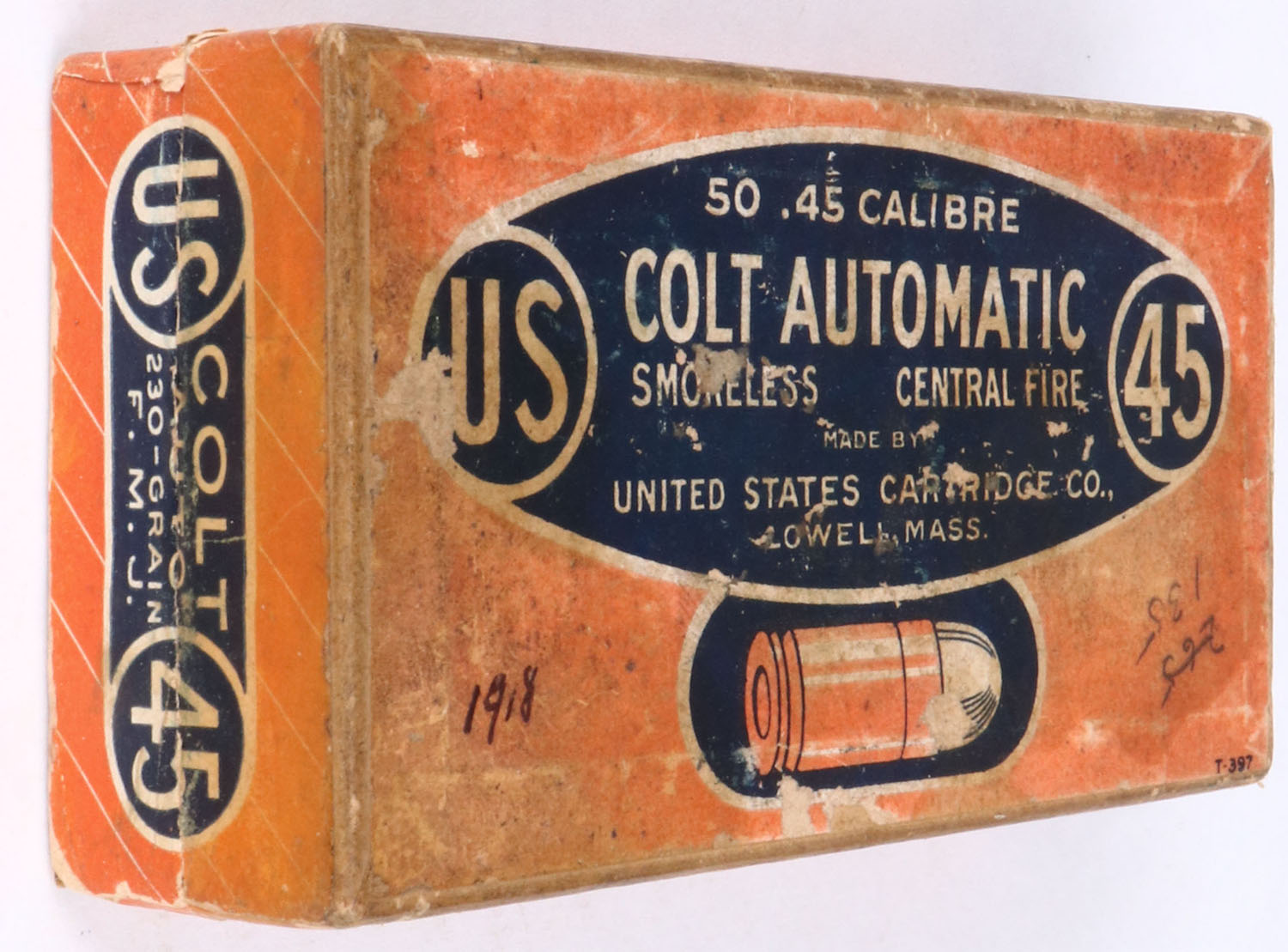 U.S. Cart. Co., .45 Colt Automatic, smokeless, 230 Gr. FMJ , 2pc, Full, buff box with orange/blue label & white print, box is solid with age soiling, pen marks, rub marks & edge wear, ammo is very good. Grade: Very Good + - Value: 30 to 60