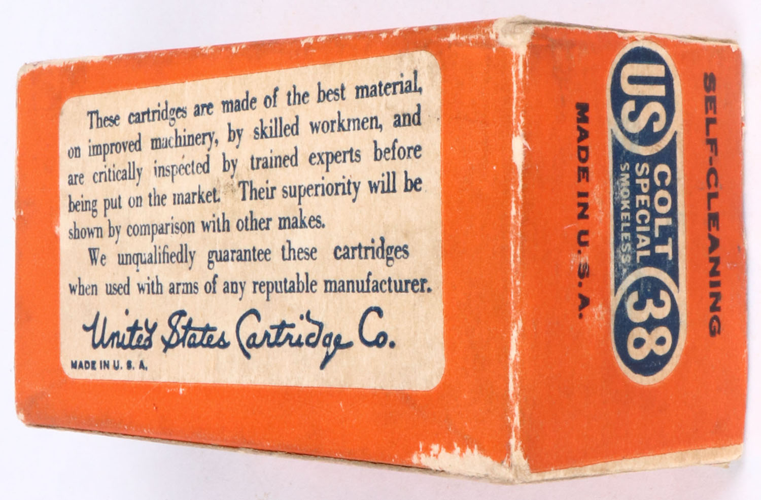 U.S. Cart. Co., .38 colt special (38 Special), smokeless, RIFLE, U.S.A. Patent Pending, 1pc, Full, buff box with orange/blue label & white/black print, box is solid with minor age soiling, light rub marks & light edge wear, ammo is very good. Grade: Very Good ++ - Value: 30 to 120