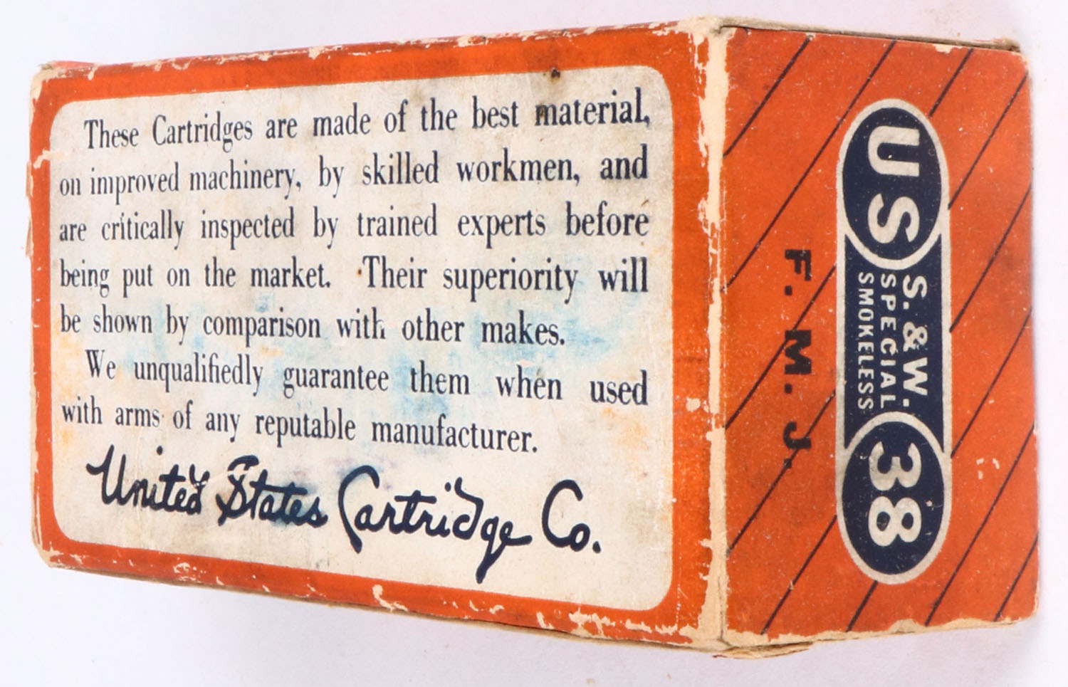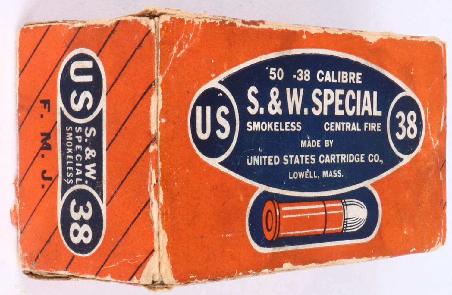 U.S. Cart. Co., .38 S & W Special, FMJ, Central Fire, 1 pc., Full., Smokeless, orange, blue & white box, box has light age soiling, rub marks & edge wear, ammo is excellent. Grade: Excellent - Value: 20 to 80