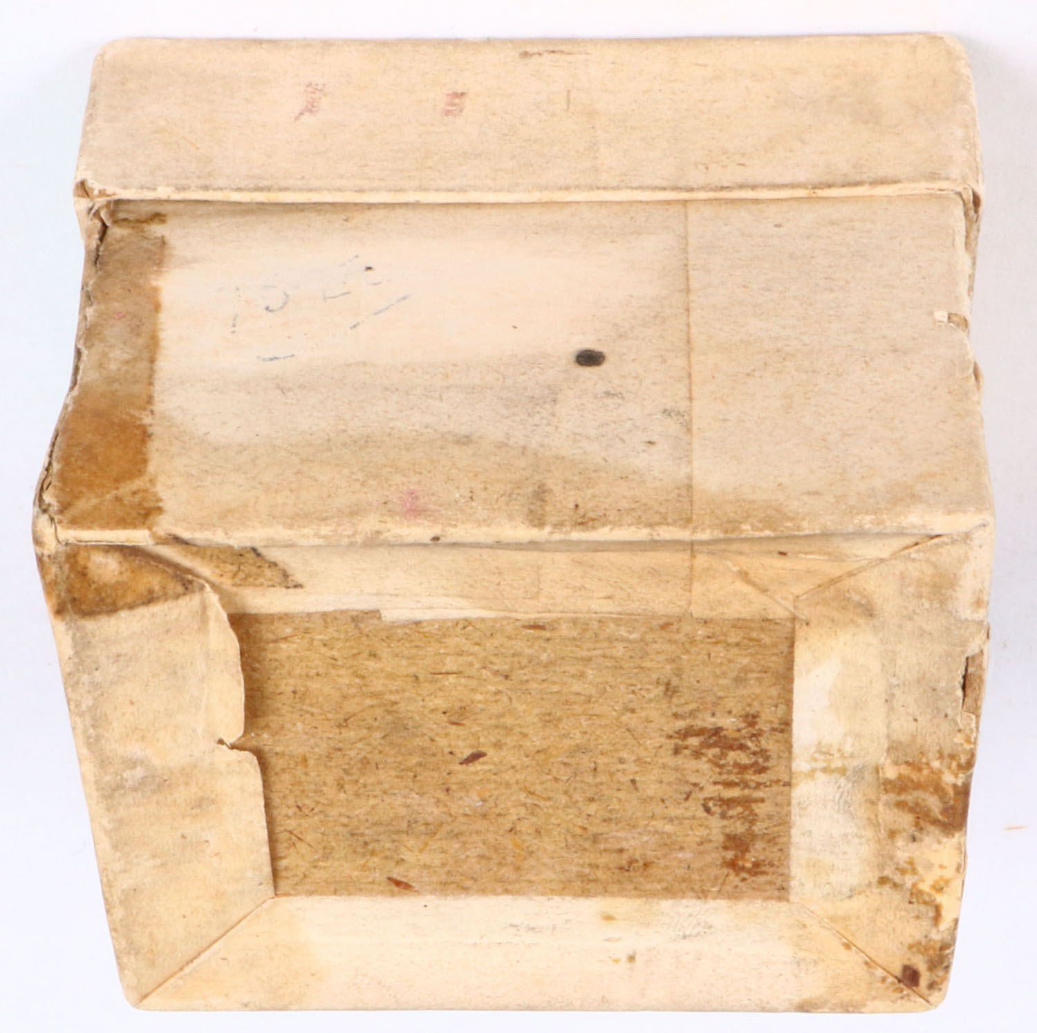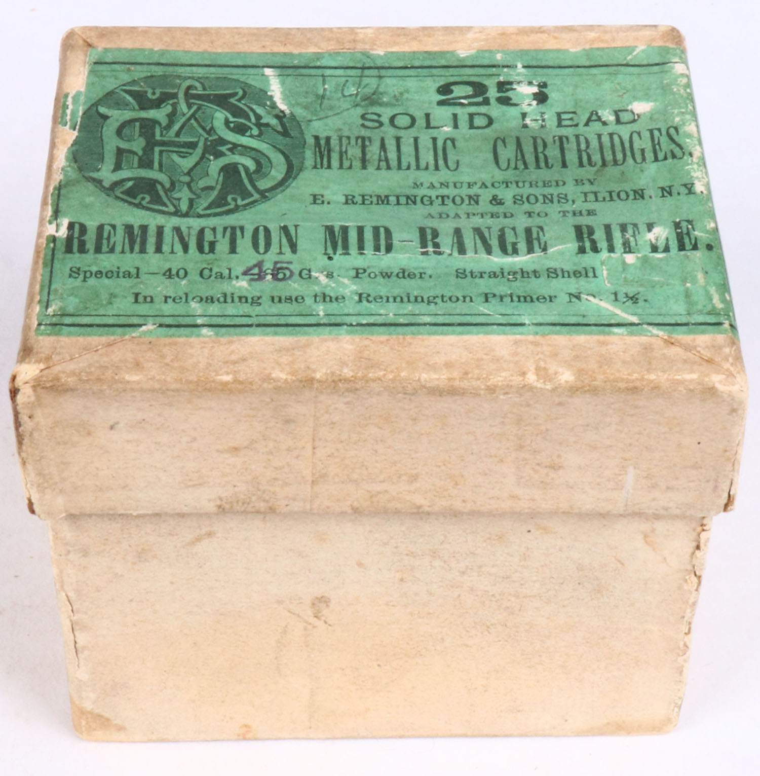 E. Remington & Sons, .40-45 Straight shell, overlabel ''45'', 2pc, empty, buff box with green label & black print, box has glue repairs on all four corner seams of bottom box, pencil marks, light rub marks, & light edge wear. Grade: Very Good ++ - Value: 30 to 200