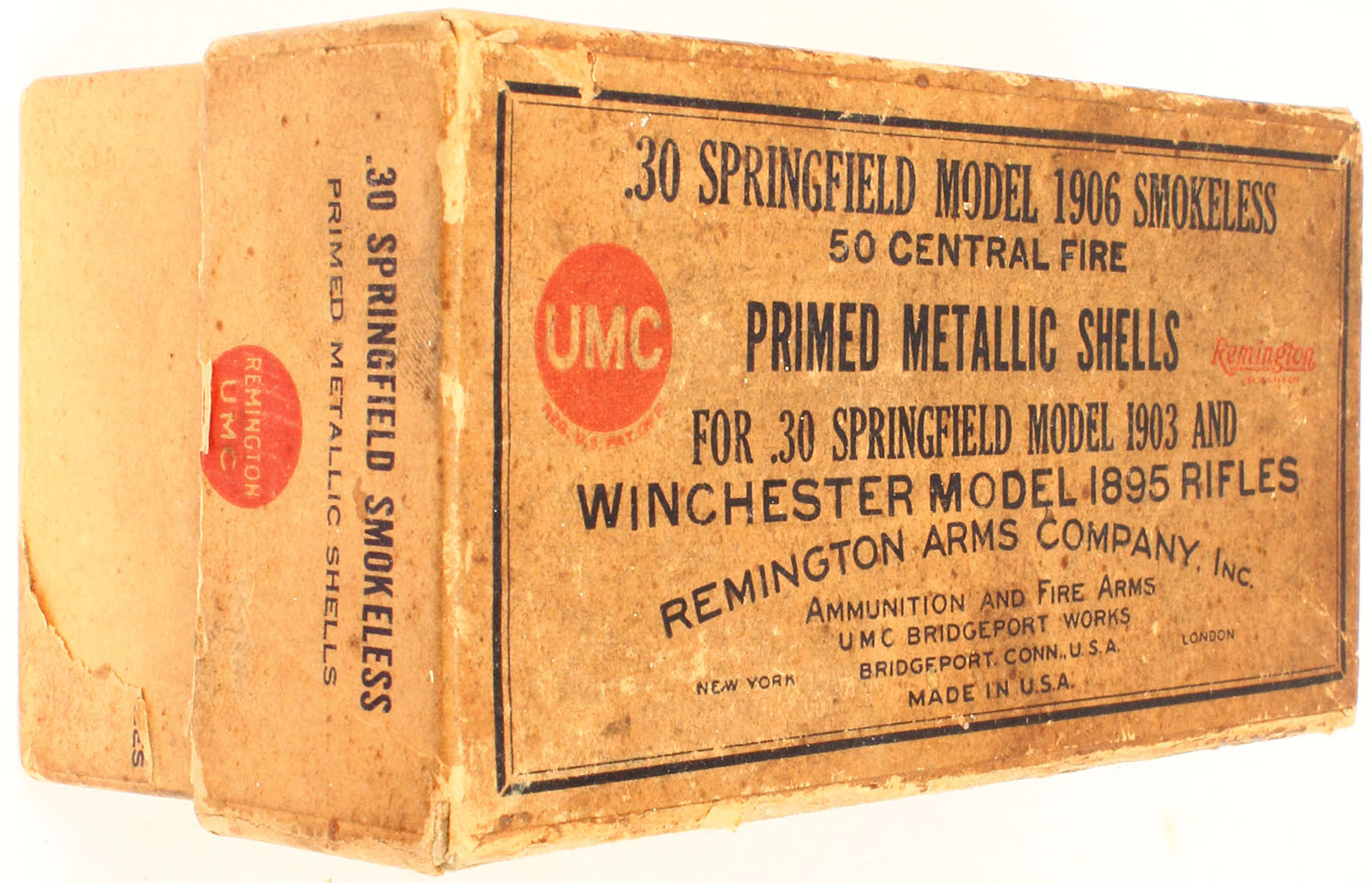 REM-UMC, .30 Springfield Model 1906 (30-06), Primed Metallic shells, smokeless, 2pc, Partial 24 shells, buff box & label with black/red print, box has two taped seam repairs on lid, age soiling, light rub marks & edge wear, shells are excellent. Grade: Very Good + - Value: 10 to 100