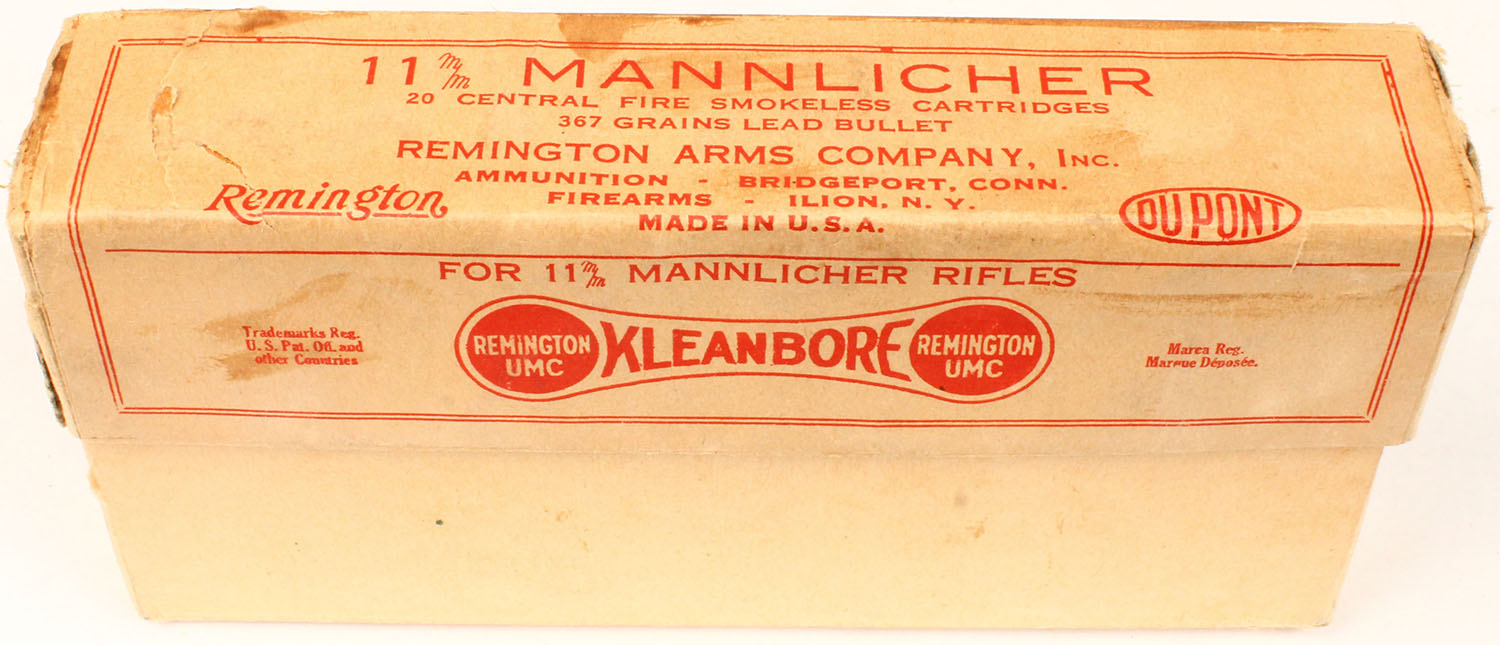 REM-UMC, Dog bone, 11mm Mannlicher, smokeless, 367 Gr. lead bullet, 2pc, Full, buff box & label with red print, box is solid with partial corner tear in lid, small tear in box on top label, & minor wear, ammo is excellent. Grade: Excellent - Value: 30 to 90