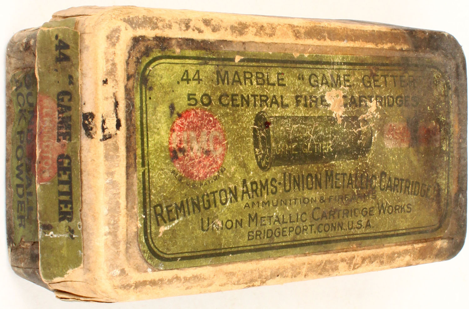 REM-UMC, .44 Marble Game Getter, black powder, round ball bullet, 2pc, Full with a couple rds. Have different color primers, buff box with green label & black/red print, box is solid with heavy black staining, age soiling, rub marks, one split corner seam on lid, parts of side labels missing, & edge wear, ammo is very good to good. Grade: Very Good - Value: 100 to 400