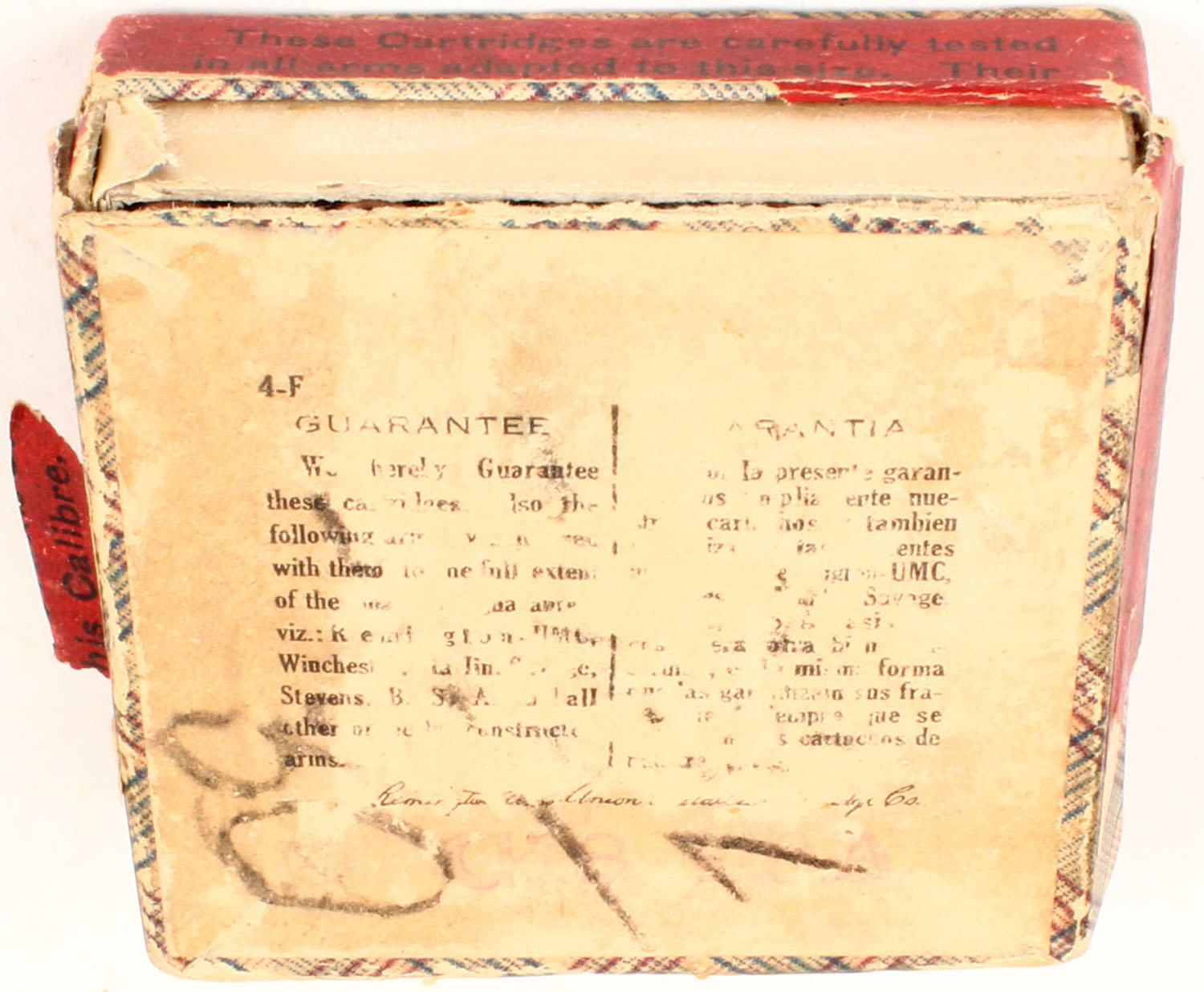 REM-UMC, .25 Short R.F., Black Powder, 2pc, Full, fabric box with green/red label & black print, box is solid with light age soiling, rub marks, light edge wear & light corner wear, ammo is very good. Grade: Excellent - Value: 50 to 150