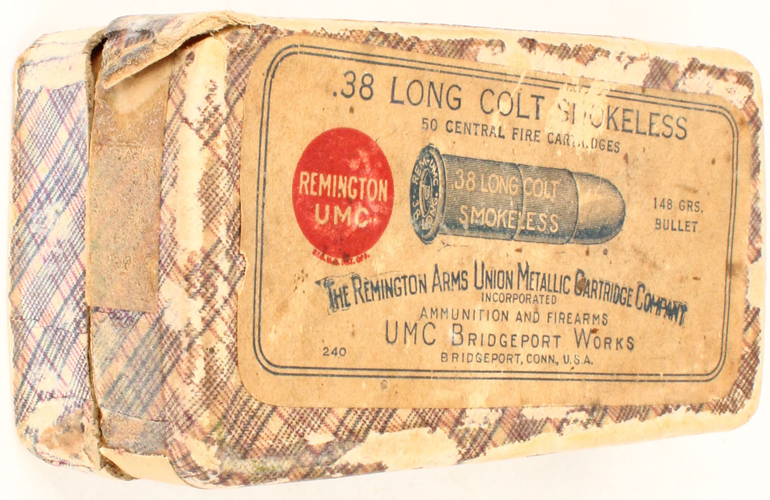REM-UMC, .38 Long Colt, Smokeless, 2pc, Full, fabric box with buff label & black print, box has two split corner seams on lid, tape, rub marks, & edge wear, ammo is very good. Grade: Very Good + - Value: 30 to 90