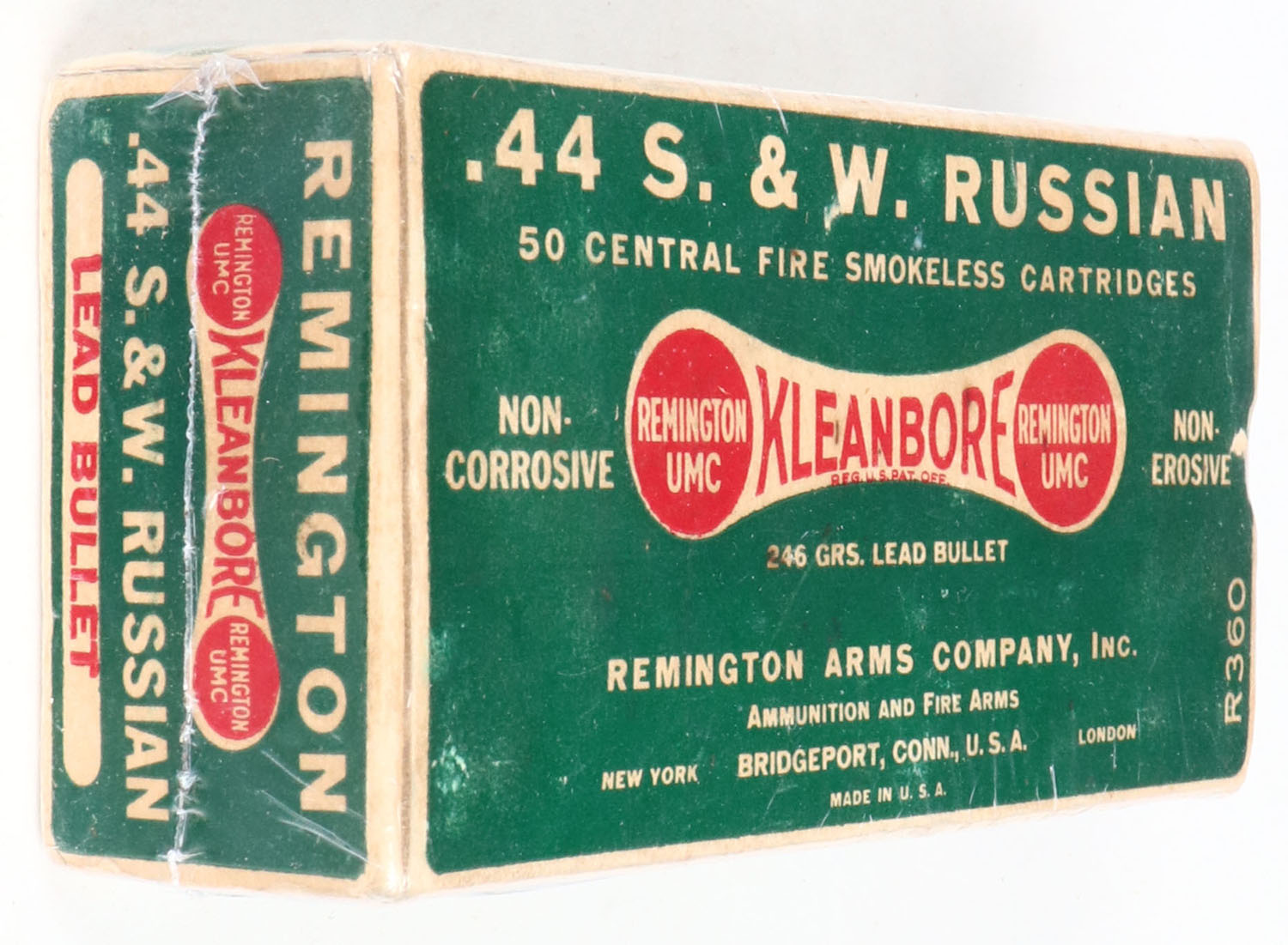 REM-UMC, Dog Bone, Kleanbore, .44 S&W Russian, 246 Gr. Lead bullet, 1pc, Full, buff box with green label & white/red print, box has one detached inside flap on left end, left end flap has a partial seam split, right end flap has a seam glue repair, light rub marks, & light edge wear, ammo is very good. Grade: Very Good ++ - Value: 60 to 120