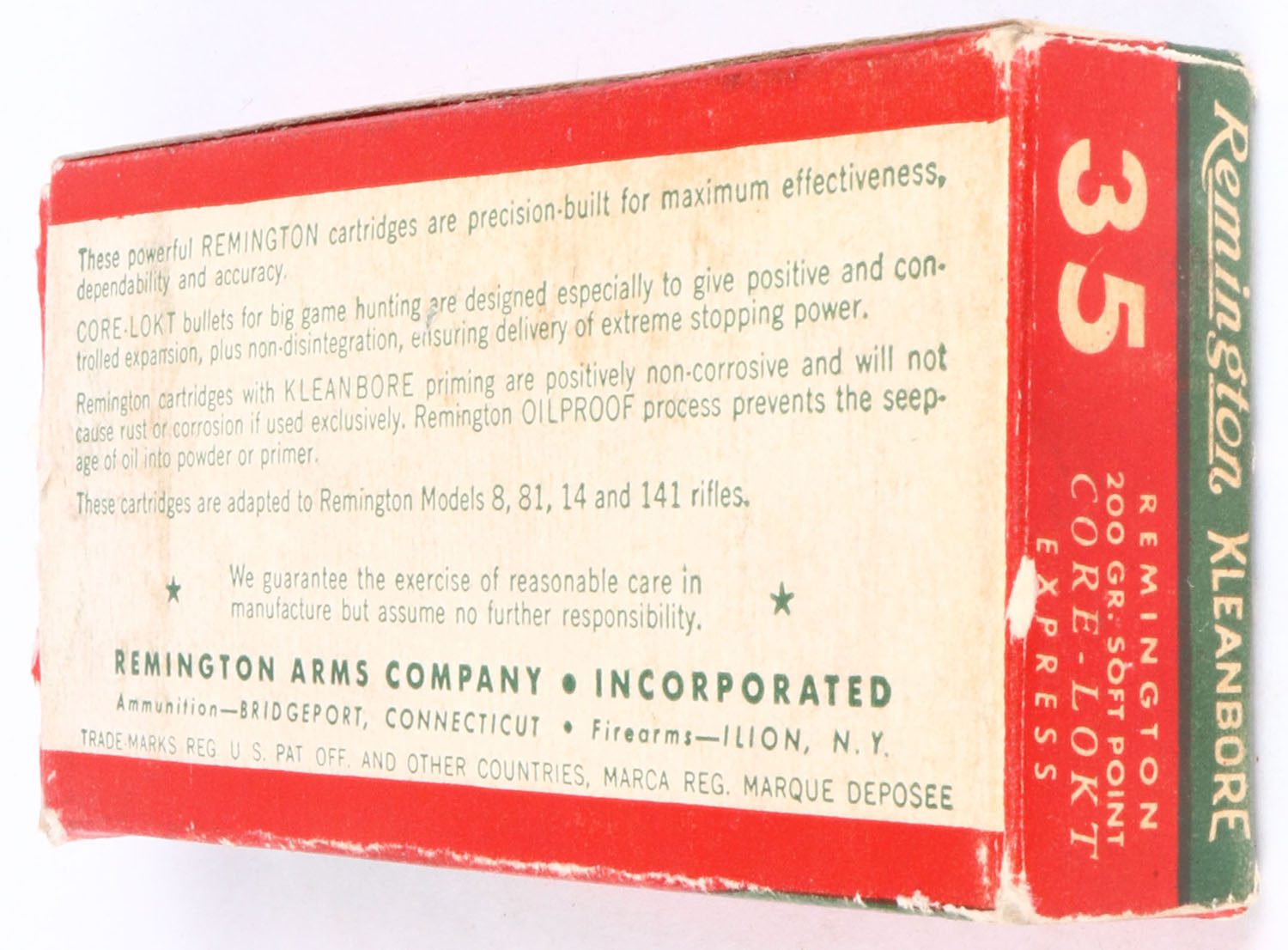 Remington, Kleanbore, .35 Remington, Express, 200 Gr. Soft point core-Lokt bullet, 1pc, Full, green/red box with white print, box is solid with excellent color, minor rub wear, & minor edge wear, ammo is excellent. Grade: Excellent + - Value: 50 to 200