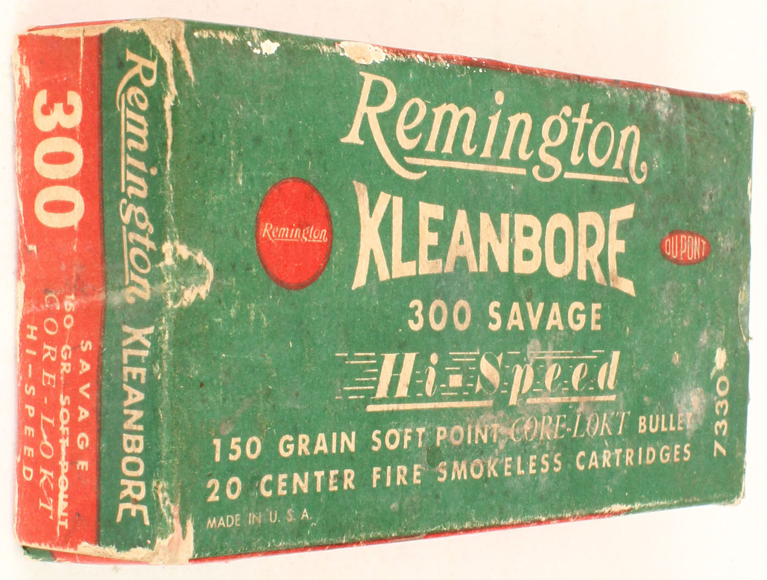 Remington, Kleanbore, .300 Savage, Hi-Speed, 180 Gr. Soft point Core-Lokt bullet, 1pc, Full, green/red box with white print, box is solid with light age soiling, minor rub marks, & light edge wear, ammo is excellent. Grade: Very Good ++ - Value: 30 to 90