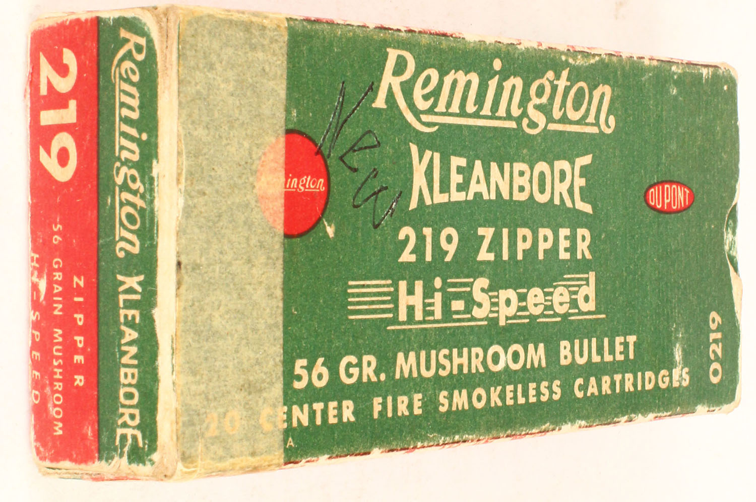 Remington, Kleanbore, .219 Zipper, Hi-Speed, 56 Gr. Mushroom bullet, 1pc, Full, green/red box with white print, box is solid with tape, pen marks, light rub marks, & edge wear, ammo is excellent. Grade: Very Good + - Value: 100 to 300
