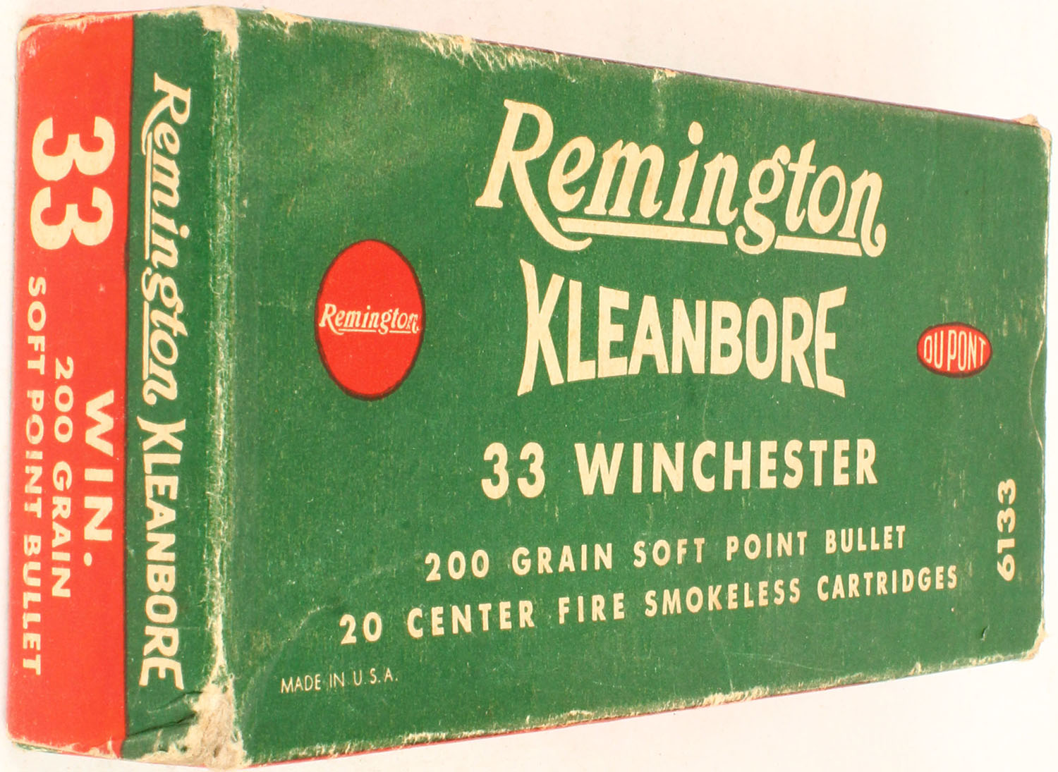 Remington, Kleanbore, .33 Winchester, 200 Gr. Soft point bullet, 1pc, Full, green/red box with white print, box is solid with, light rub marks, & light edge wear, ammo is very good. Grade: Excellent - Value: 100 to 300