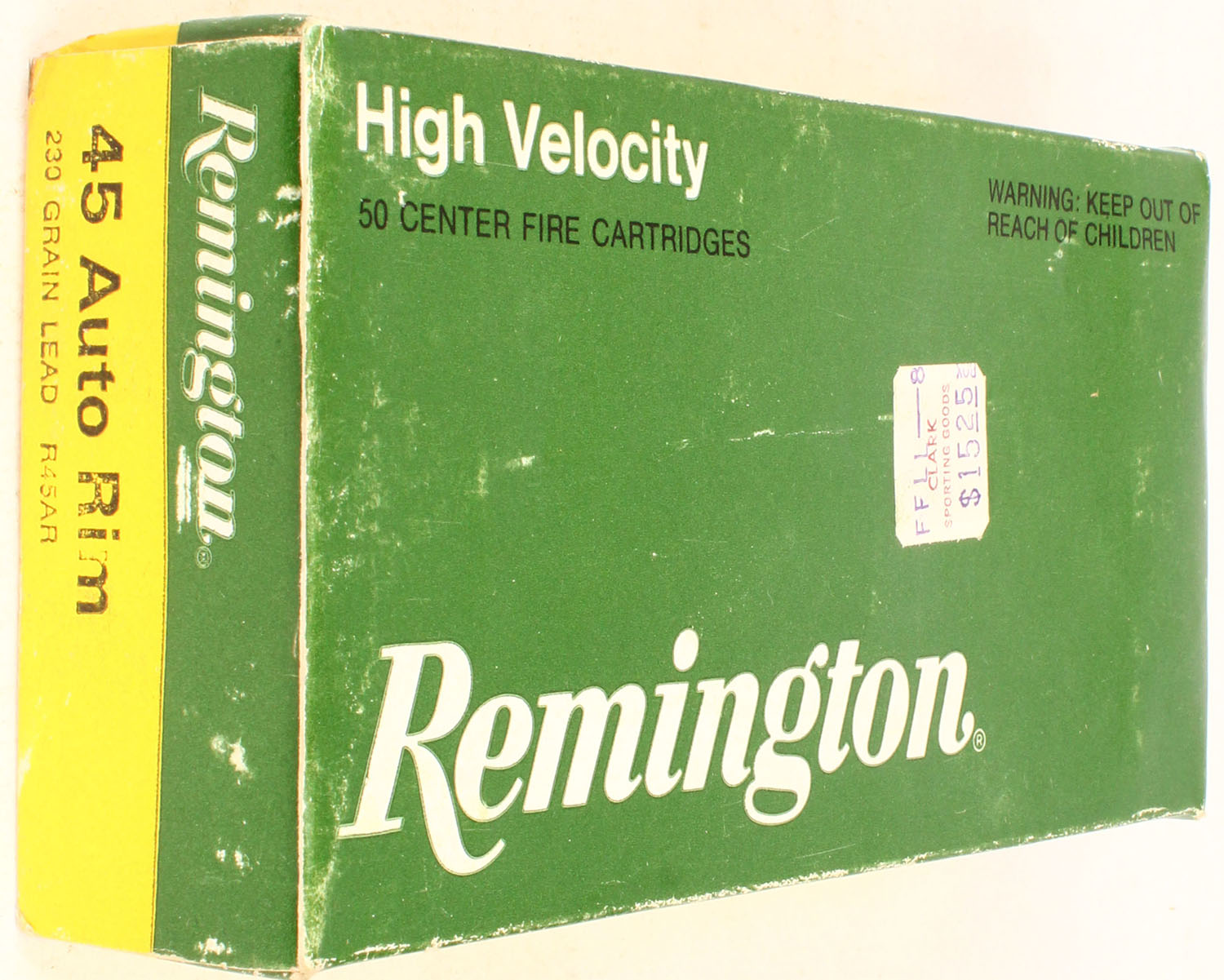 Remington, High Velocity, .45 Auto Rim, 230 Gr. Lead bullet, 1pc, Full, green/yellow box with white/black print, box is solid with sticker on face, light rub marks & light edge wear, ammo is very good. Grade: Excellent - Value: 60 to 120
