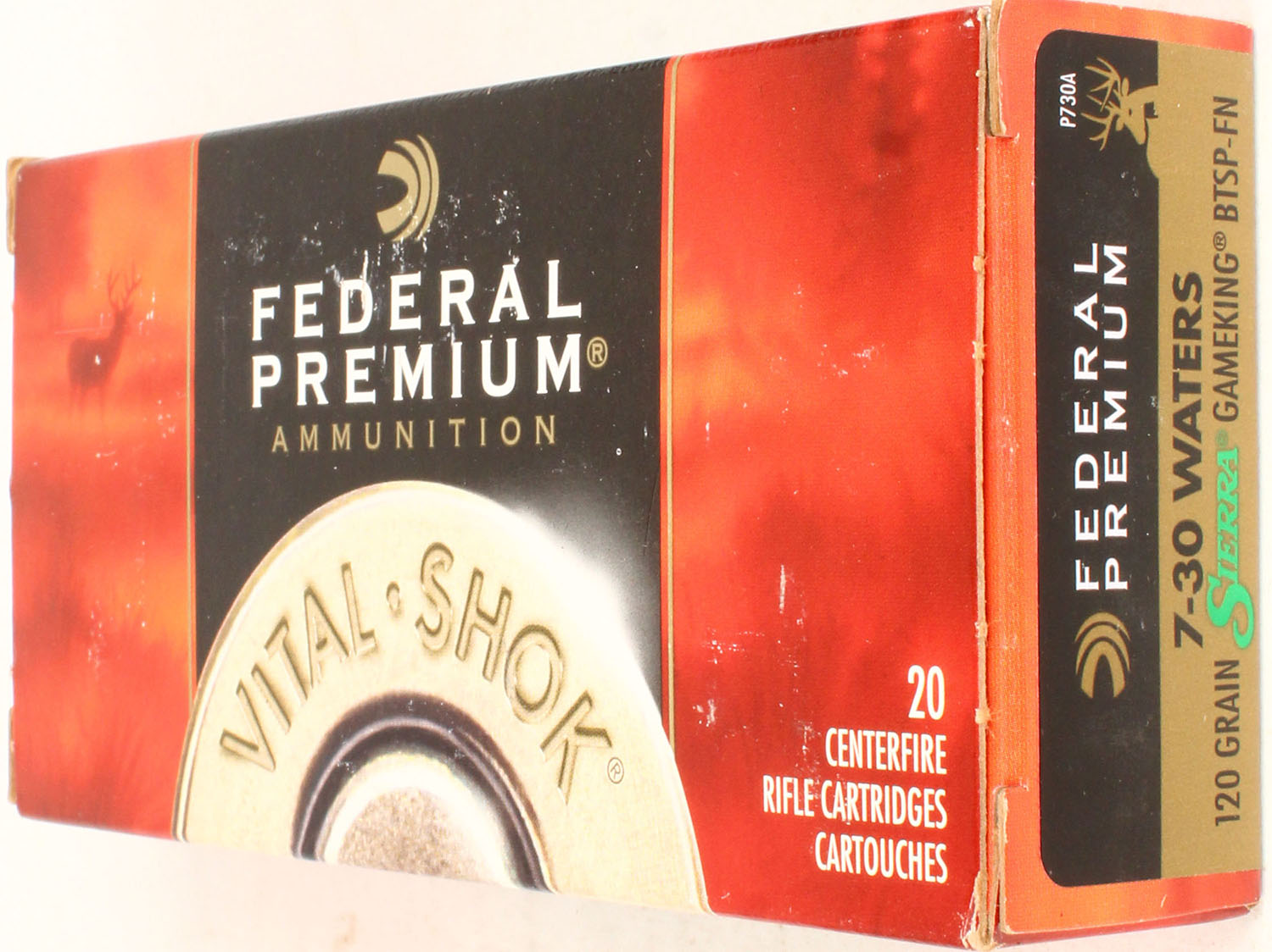 Federal, Vital-Shok, 7-30 Waters, 120 Grain Sierra Gameking BTSP-FN, Full, 1pc. multi-colored box, box is solid with excellent color, Ammo is excellent. Grade: Excellent - Value: 20 to 60