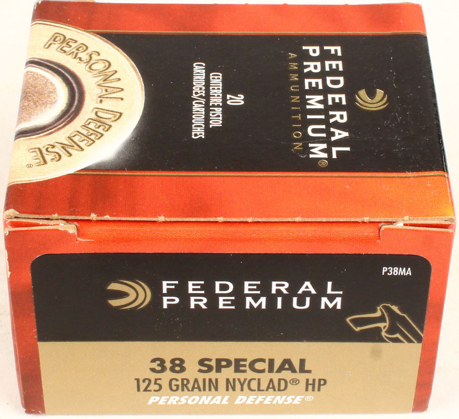 Federal, Premium, 38 SPL, 125 Grain Nyclad HP, Full, 1pc. multi-colored box, box is solid with excellent color, Ammo is excellent. Grade: Excellent - Value: 20 to 60