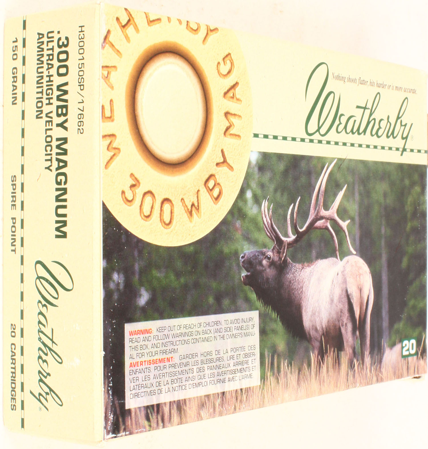 Weatherby, 300 WBY Magnum, 150 Grain Ultra-High Velocity Spire Point, Full, 1pc. multi-colored box, box is solid with excellent color, Ammo is excellent. Grade: Excellent - Value: 20 to 60