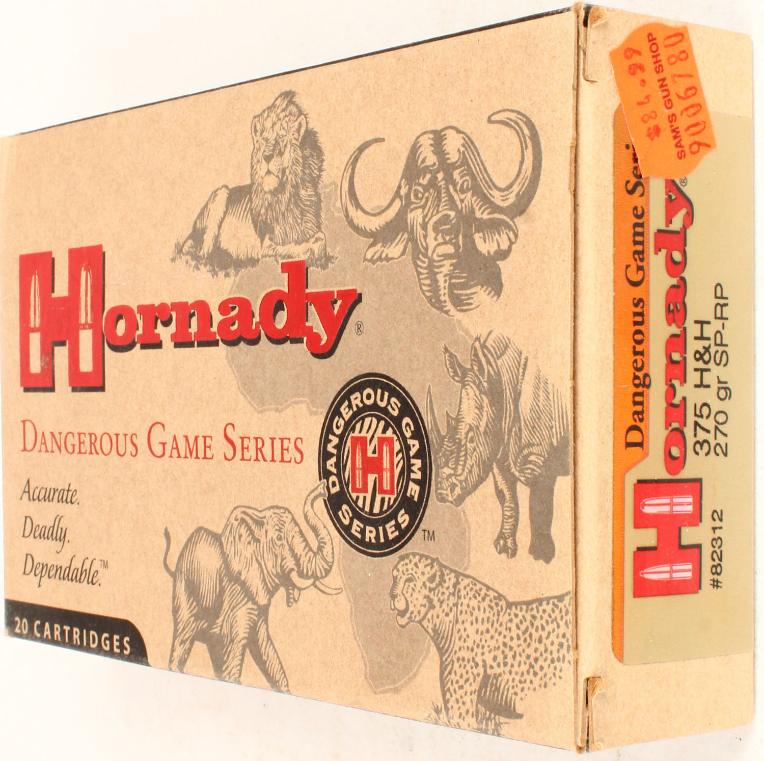 Hornady, Dangerous Game Series, 375 H&H, 270 Grain SP-RP, Full, 1pc. multi-colored box, box is solid with excellent color, Ammo is excellent. Grade: Excellent - Value: 20 to 60