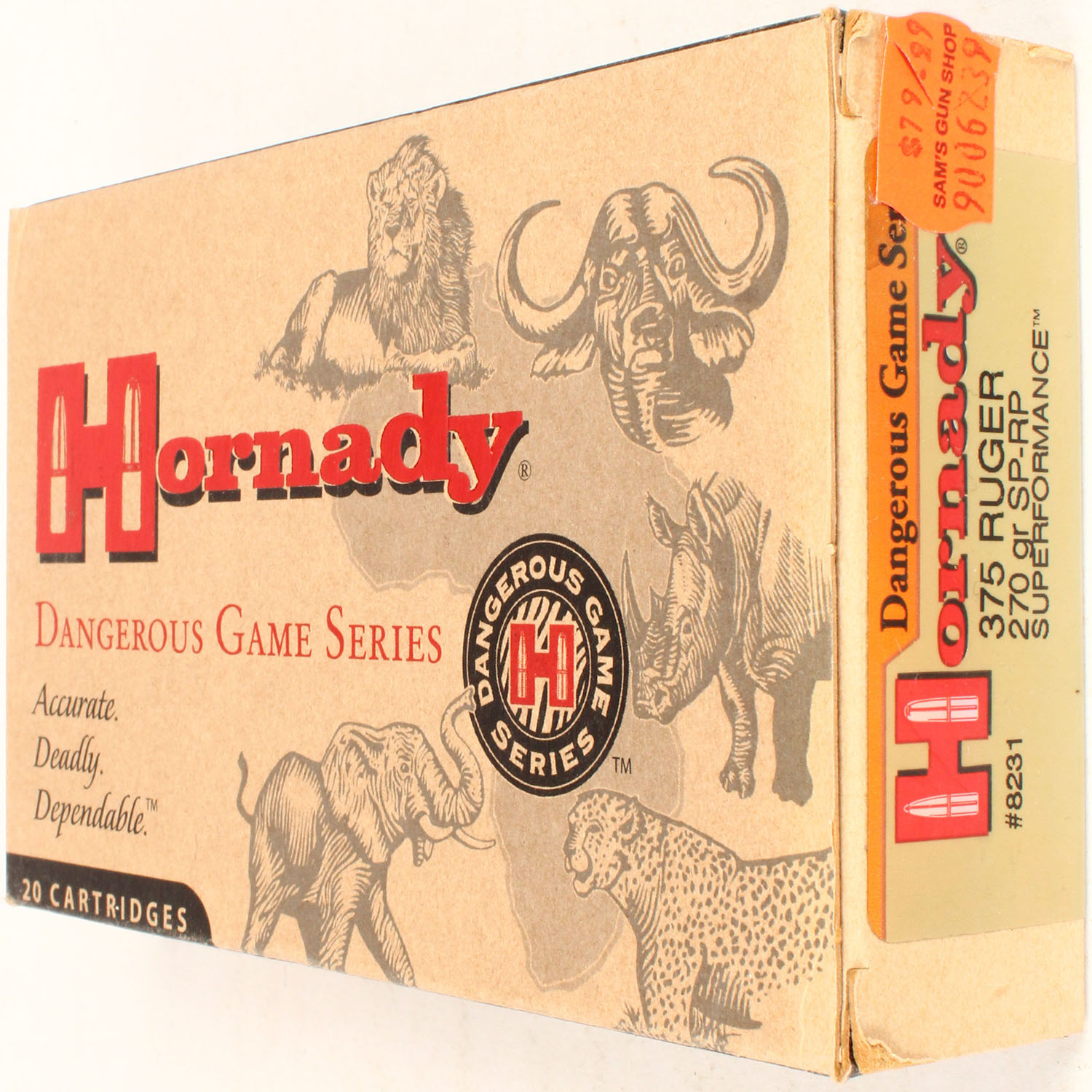 Hornady, Dangerous Game Series, 375 Ruger, 270 Grain , Full, SP-RP, 1pc. multi-colored box, box is solid with excellent color, Ammo is excellent. Grade: Excellent - Value: 20 to 60