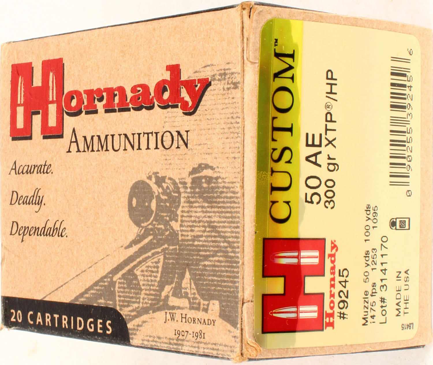 Hornady, CUSTOM, 50 AE, 300 Grain XTP/HP, Full, 1pc. multi-colored box, box is solid with excellent color, Ammo is excellent. Grade: Excellent - Value: 20 to 60