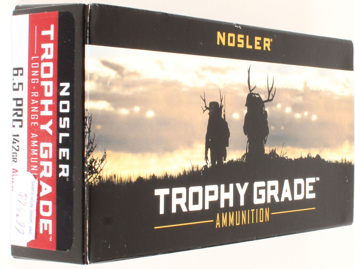 Nosler, Trophy Grade, 6.5 PRC, 142 Grain ABLR, Full, 1pc. multi-colored box, box is solid, with excellent color, Ammo is excellent. Grade: Excellent ++ - Value: 20 to 50