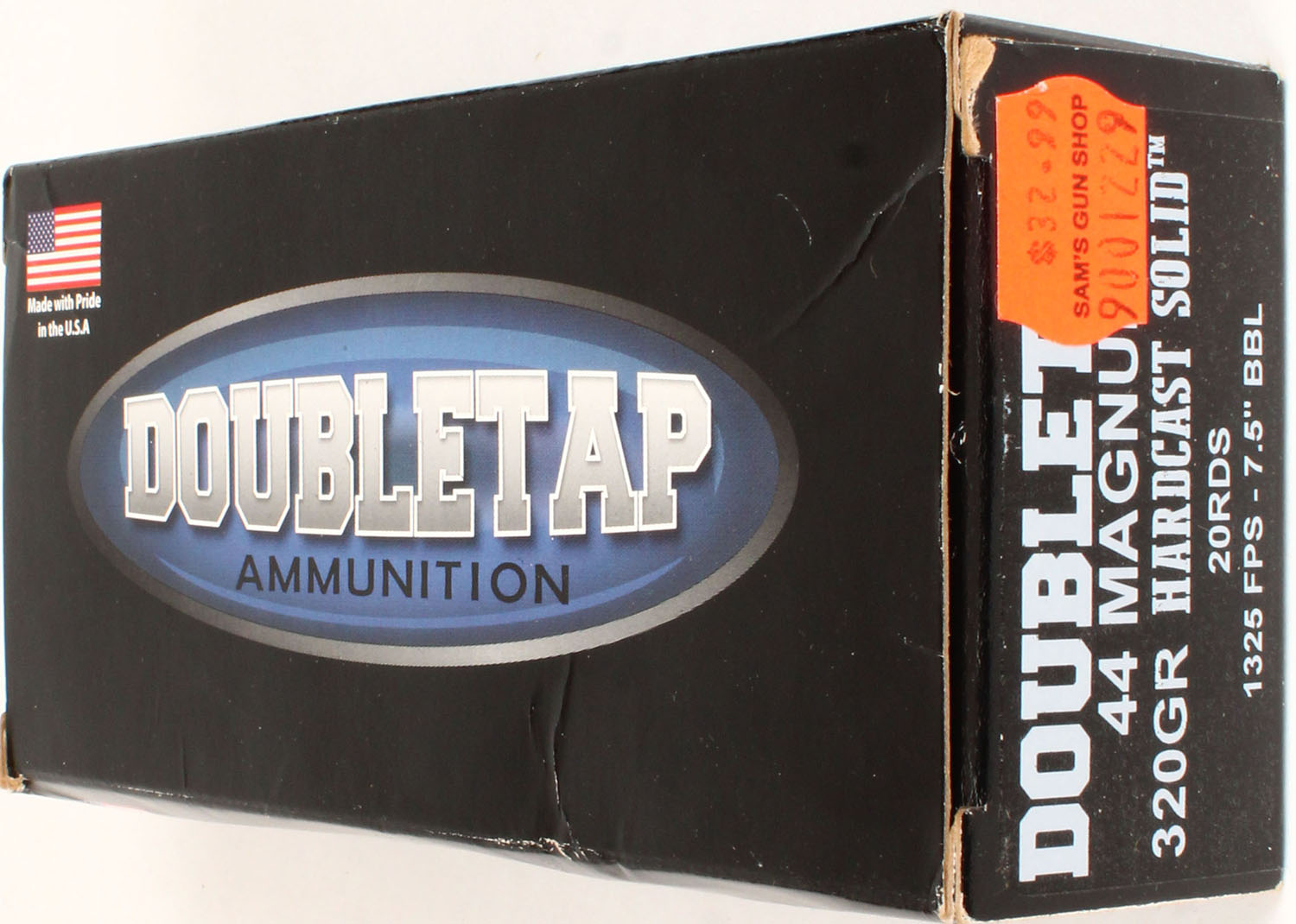 Doubletap, 44 mag., 320 Grain, Full, 1pc. Multi-colored box, box is solid, with excellent color, Ammo is excellent. Grade: Excellent ++ - Value: 20 to 80