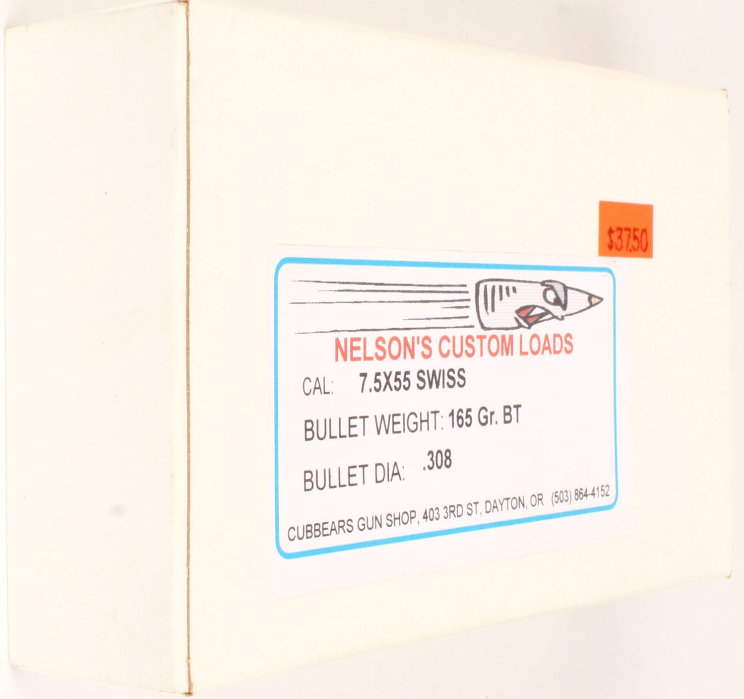 Nelsons Custom Loads, 7.5x55, 124 gr. FMJ, Full, 1pc. multi-colored box, box is solid, Ammo is excellent. Grade: Excellent - Value: 16 to 60
