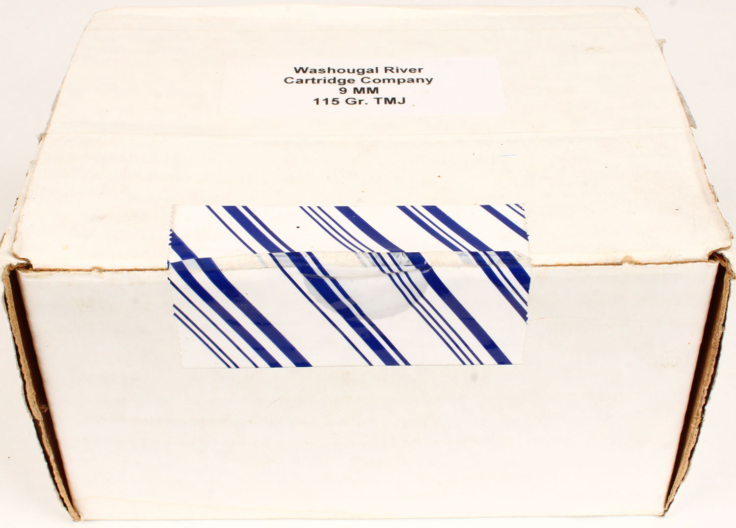 Washougal River Cart. Co., 9 mm, 115 Gr. TMJ, Full, 1pc. box is solid, Ammo is excellent. Grade: Excellent - Value: 10 to 60