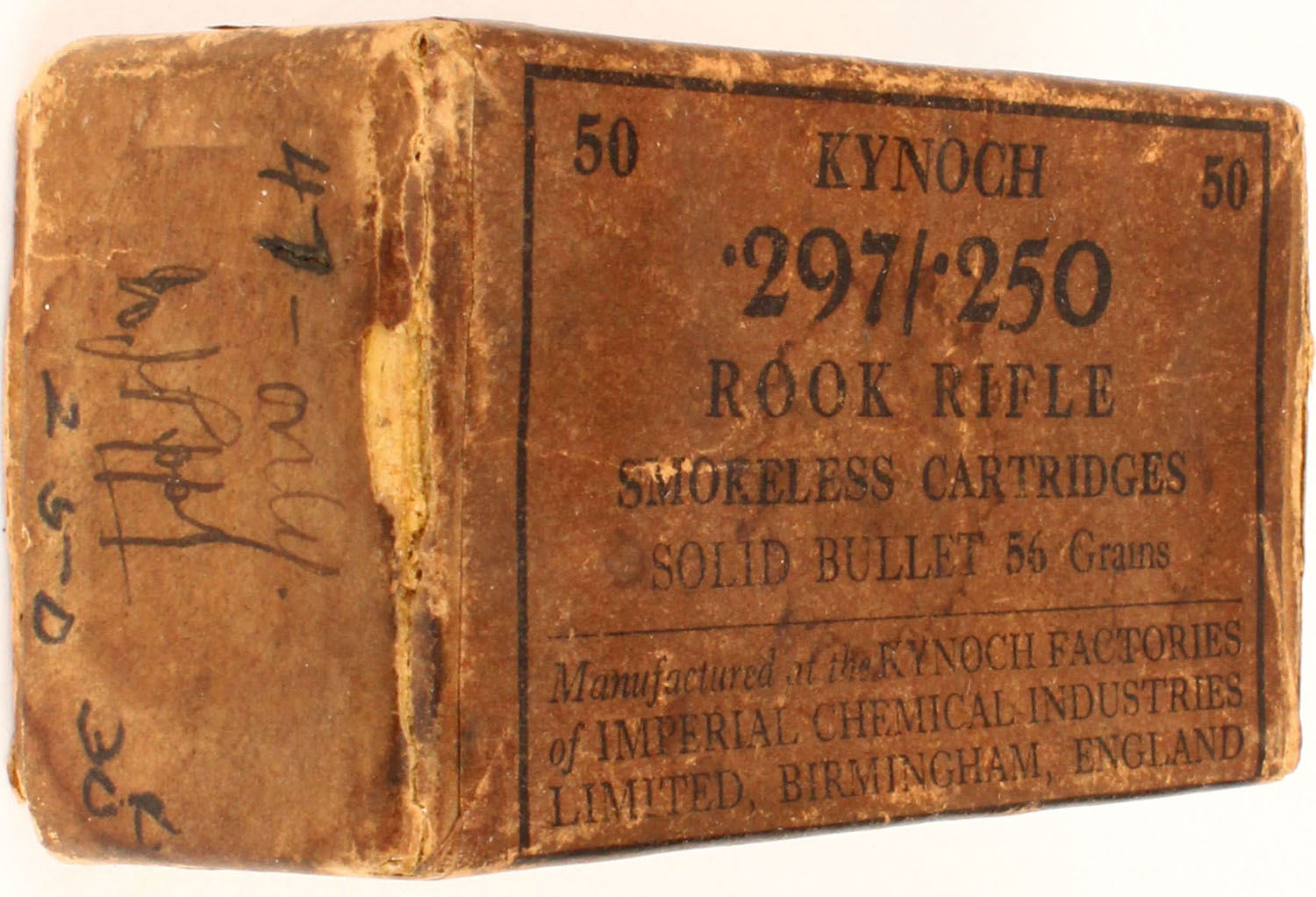 Kynoch, .297/.250 Rook Rifle Cartridges, Full., 2pc. Buff box with tan top & side sealing labels, box has seams splits to bottom, labels have age soiling, ammo is excellent. Grade: Very Good - Value: 50 to 250