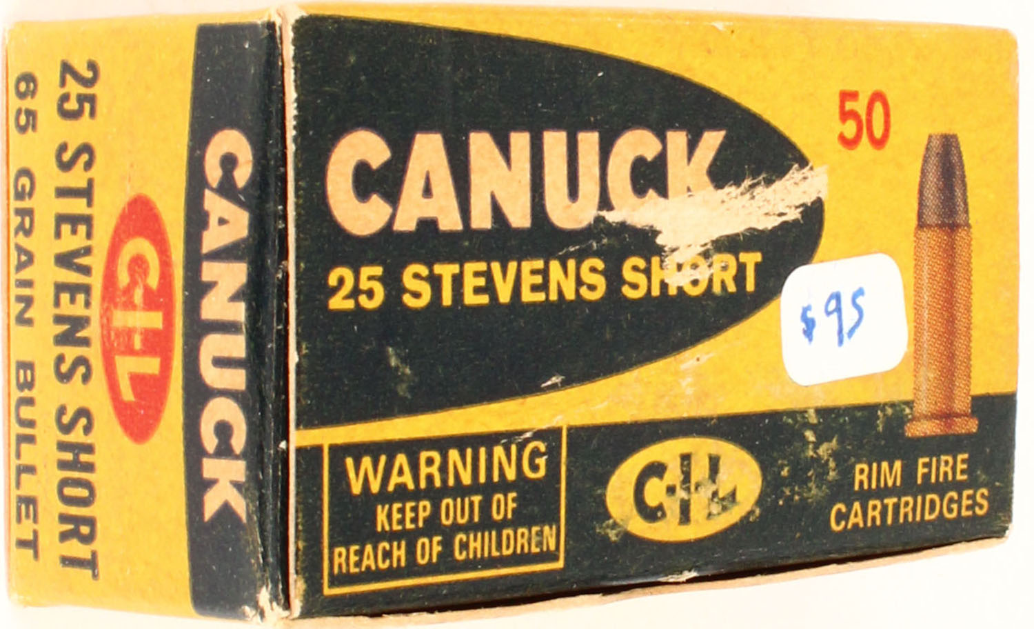 CIL, Canuck, 25 Stevens Short, 65 Grain, Full, 1pc. Multi-colored box, box has scuffing, Ammo is very good. Grade: Very Good + - Value: 50 to 150