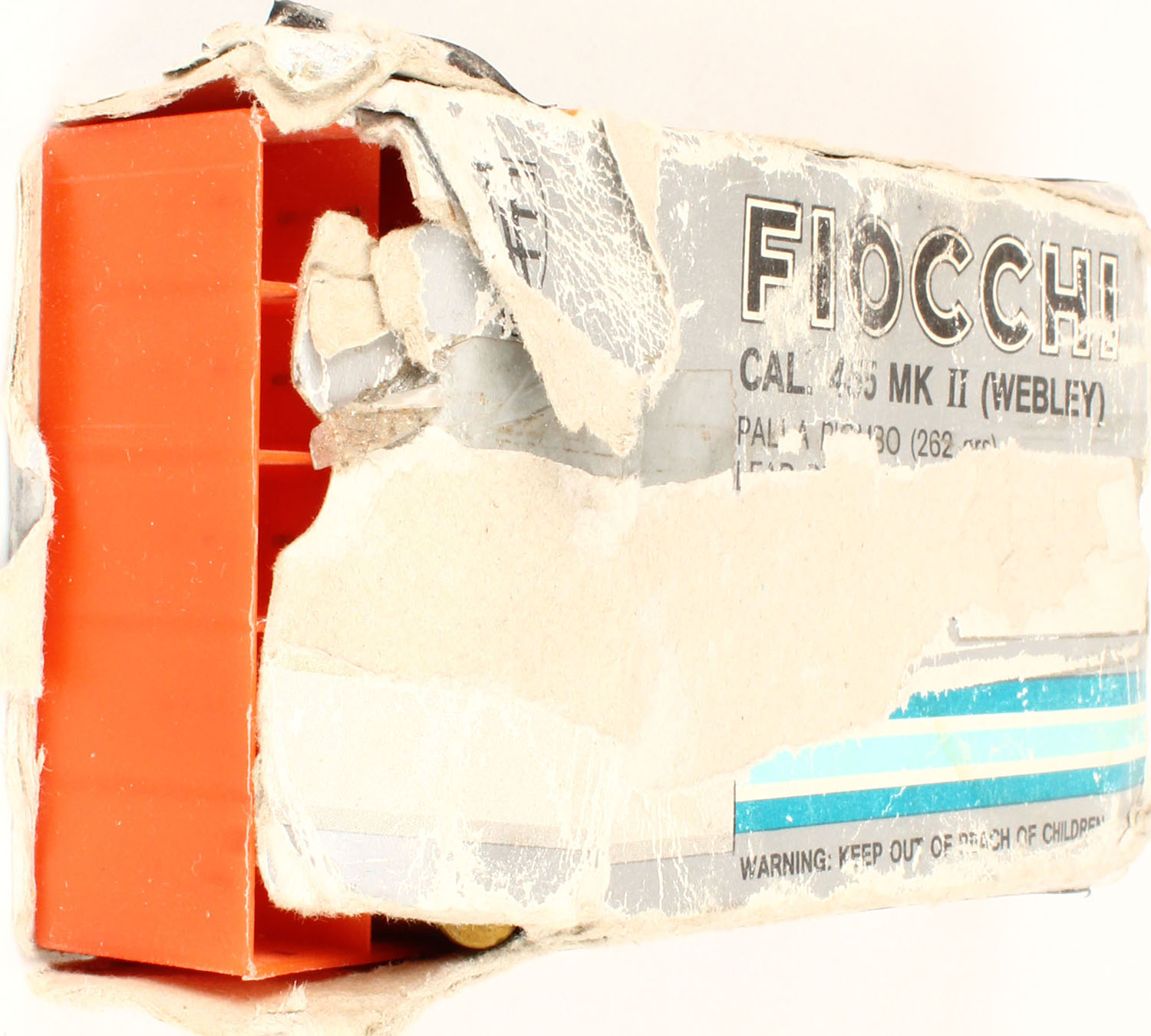 Fiocchi, .455 MK II (Webley), 38 rds., 1pc. Multi-colored box, box has complete fallen off, Ammo is excellent. Grade: Good - Value: 30 to 150