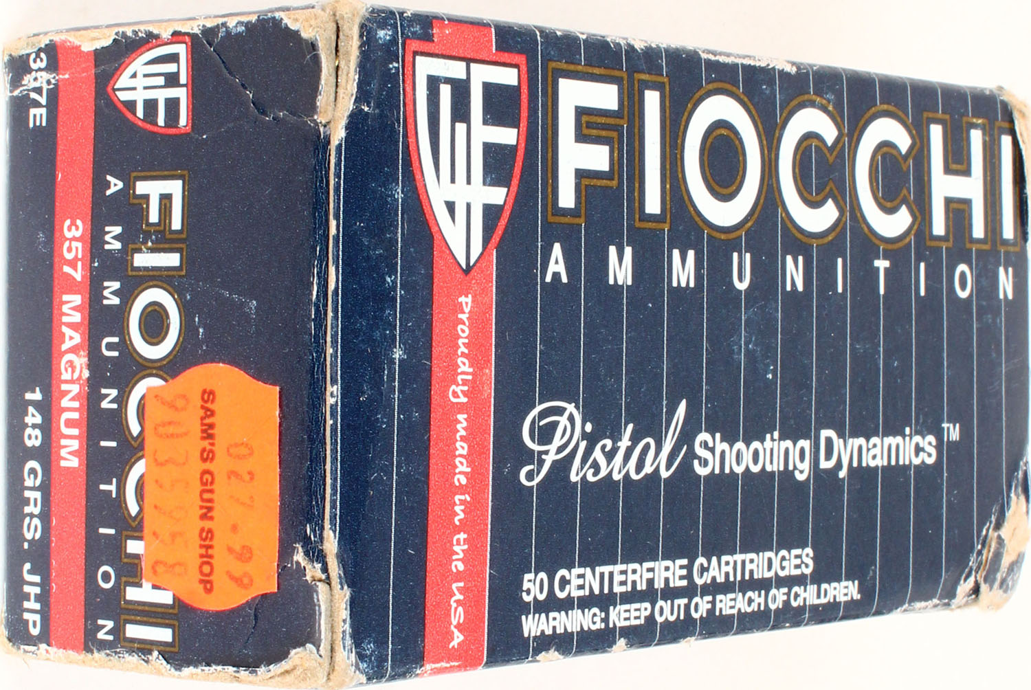 Fiocchi, .357 Mag., 148 Grain JHP, Full, 1pc. Multi-colored box, box has scuffing, has excellent color, Ammo is excellent. Grade: Excellent - Value: 20 to 60