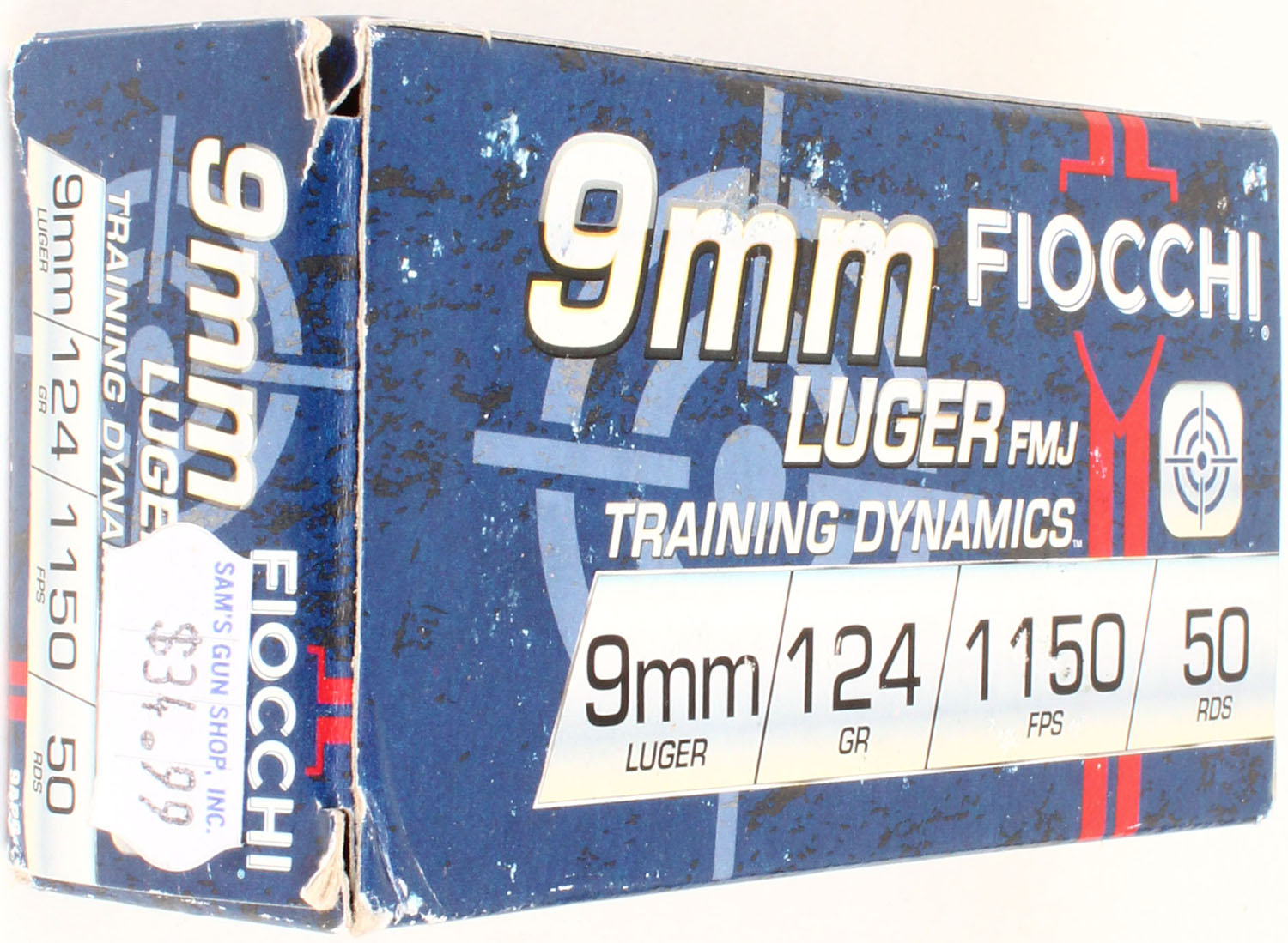 Fiocchi, 9mm Luger, 124 Grain, Full, 1pc. Multi-colored box, box has scuffing, has excellent color, Ammo is excellent. Grade: Excellent - Value: 10 to 50