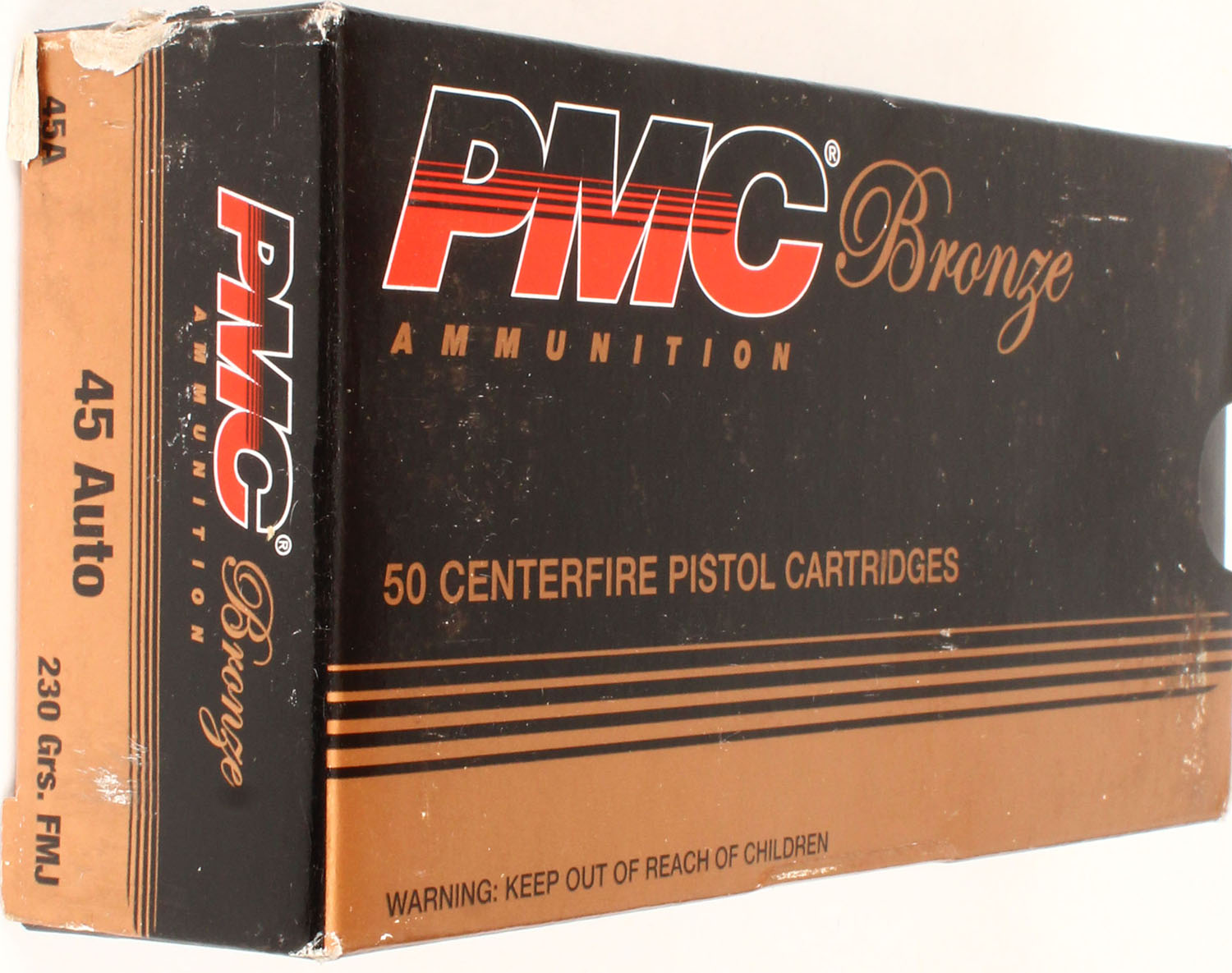 PMC, Bronze, .45 auto, 230 gr. FMJ, Full, 1pc. multi-colored box, box is solid, with excellent color, Ammo is excellent. Grade: Excellent ++ - Value: 16 to 60