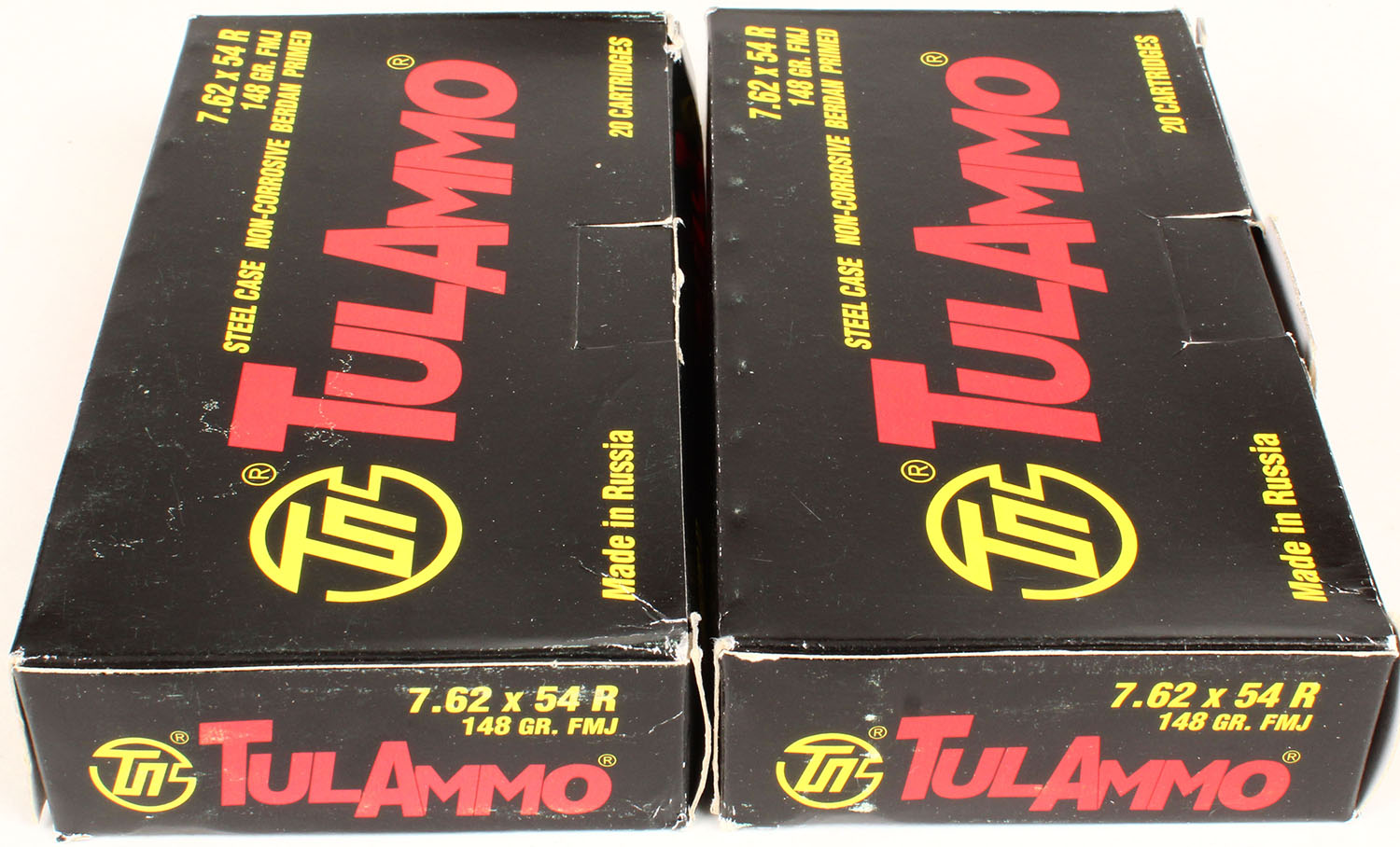Lot of 2 TulAmmo, 7.62x54R, 148 Grain FMJ, Full, 1pc. Multi-colored box, box is solid, with excellent color, Ammo is excellent. Grade: Excellent - Value: 20 to 60