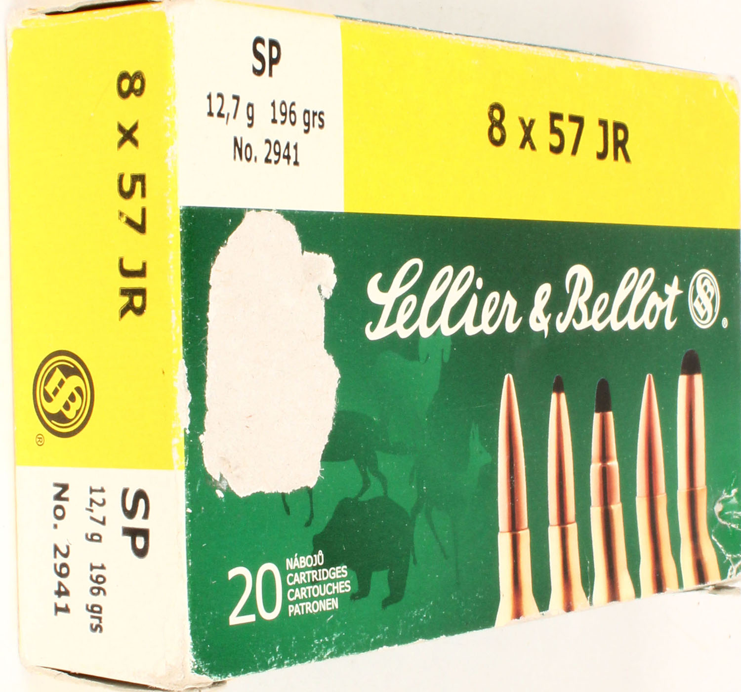 Sellier & Bellot, 8x57 JR, 196 Grs. SP, Full, 1pc. Multi-colored box, box is solid, with excellent color, Ammo is excellent. Grade: Excellent - Value: 20 to 60