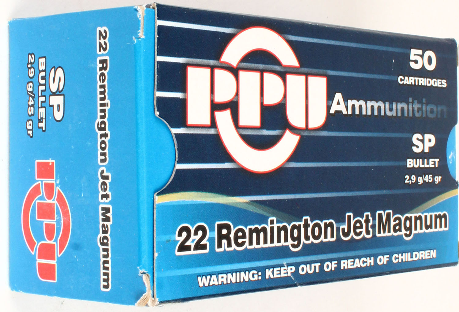 PPU, 22 Rem Jet Mag, 45 Grs. SP, Full, 1pc. Multi-colored box, box is solid, with excellent color, Ammo is excellent. Grade: Excellent - Value: 20 to 60