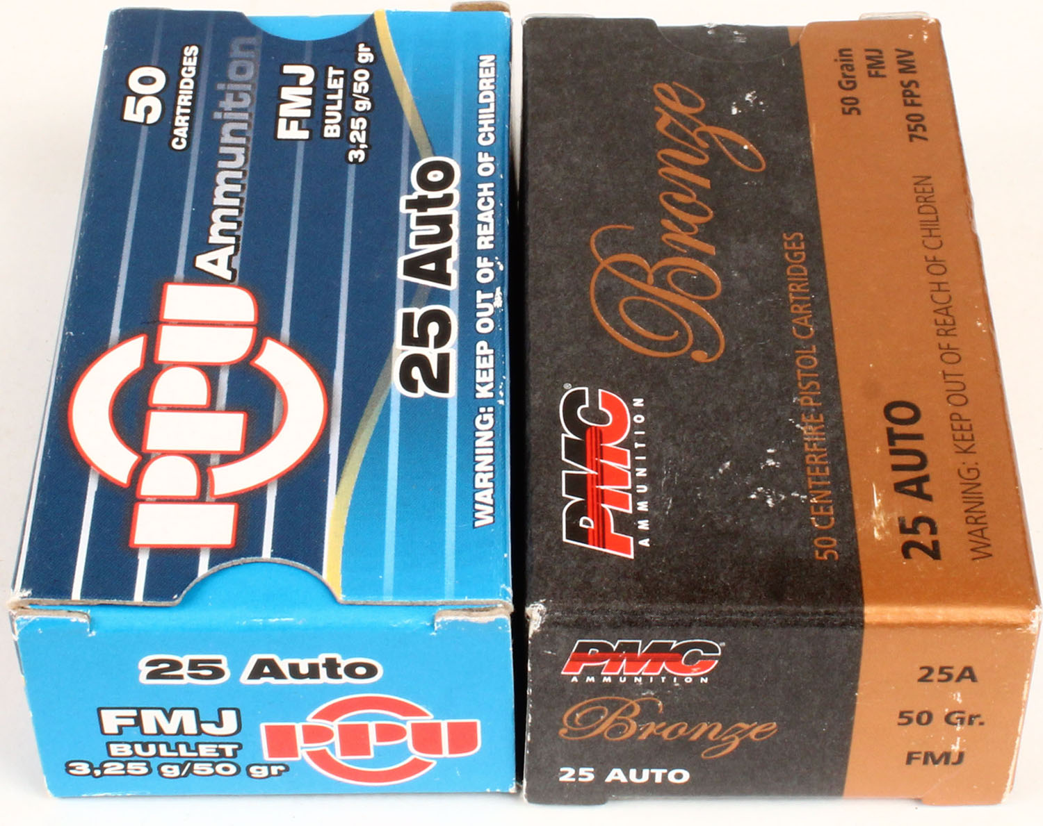 Lot of 2 PPU/PMC, 25 Auto, 50 Grs. FMJ, Full, 1pc. Multi-colored box, box is solid, with excellent color, Ammo is excellent. Grade: Excellent - Value: 20 to 60