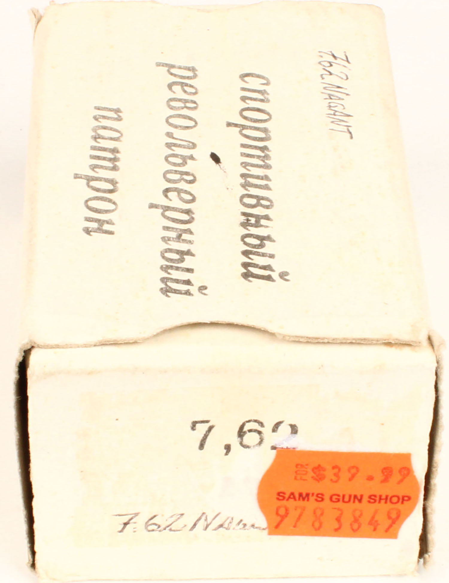 Russian Ammo, 7.62 Nagant, Unknown Grain, Full, 1pc. Black & white box, box is solid, but has light soiling with very nice color, Ammo is excellent. Grade: Excellent - Value: 20 to 60