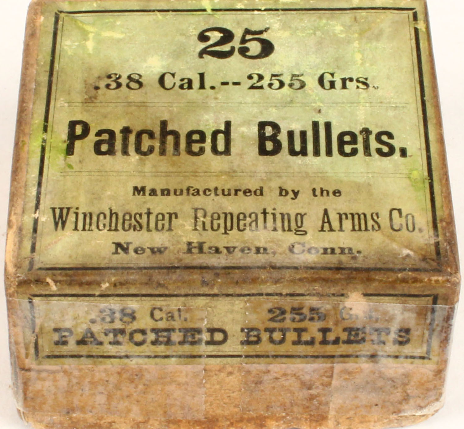 Winchester, .38 Cal. 255 Grs. Patched Bullets, Full but incorrect, 2pc. Buff box with green label, box is solid with very nice color, age soiling & tape repair, bullets are good. Grade: Very Good ++ - Value: 10 to 40