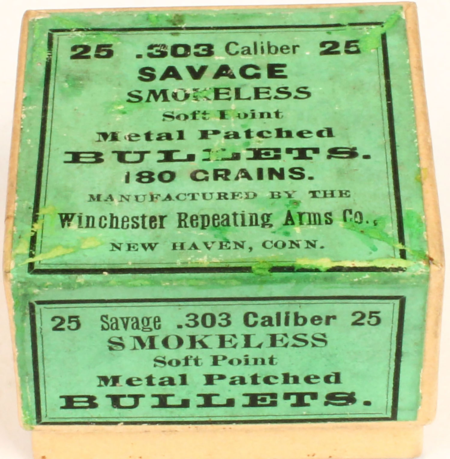 Winchester, .303 Cal. Savage, 180 Grs. Metal Patched Soft Point, Full, 2pc. Buff box with green label, box is solid with very nice color, light soiling & light scuffing, bullets are excellent. Grade: Excellent - Value: 20 to 60