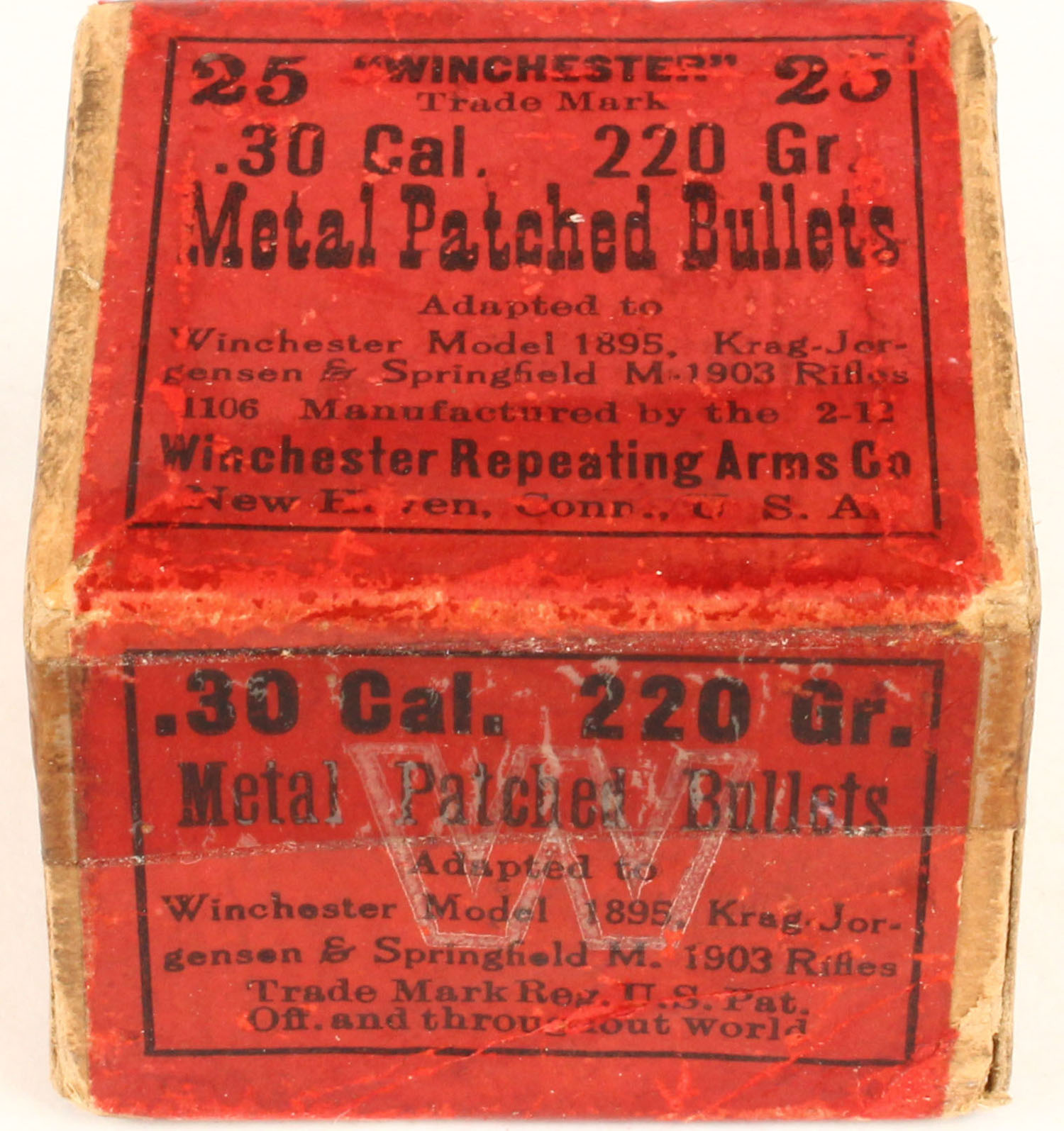 Winchester, .30 Cal., 220 Grs. Metal Patched Bullets, Full, 2pc. Buff box with red label, box has tape repair, small seam splits & small scuffing, with great colors, Bullets are excellent. Grade: Excellent - Value: 20 to 60