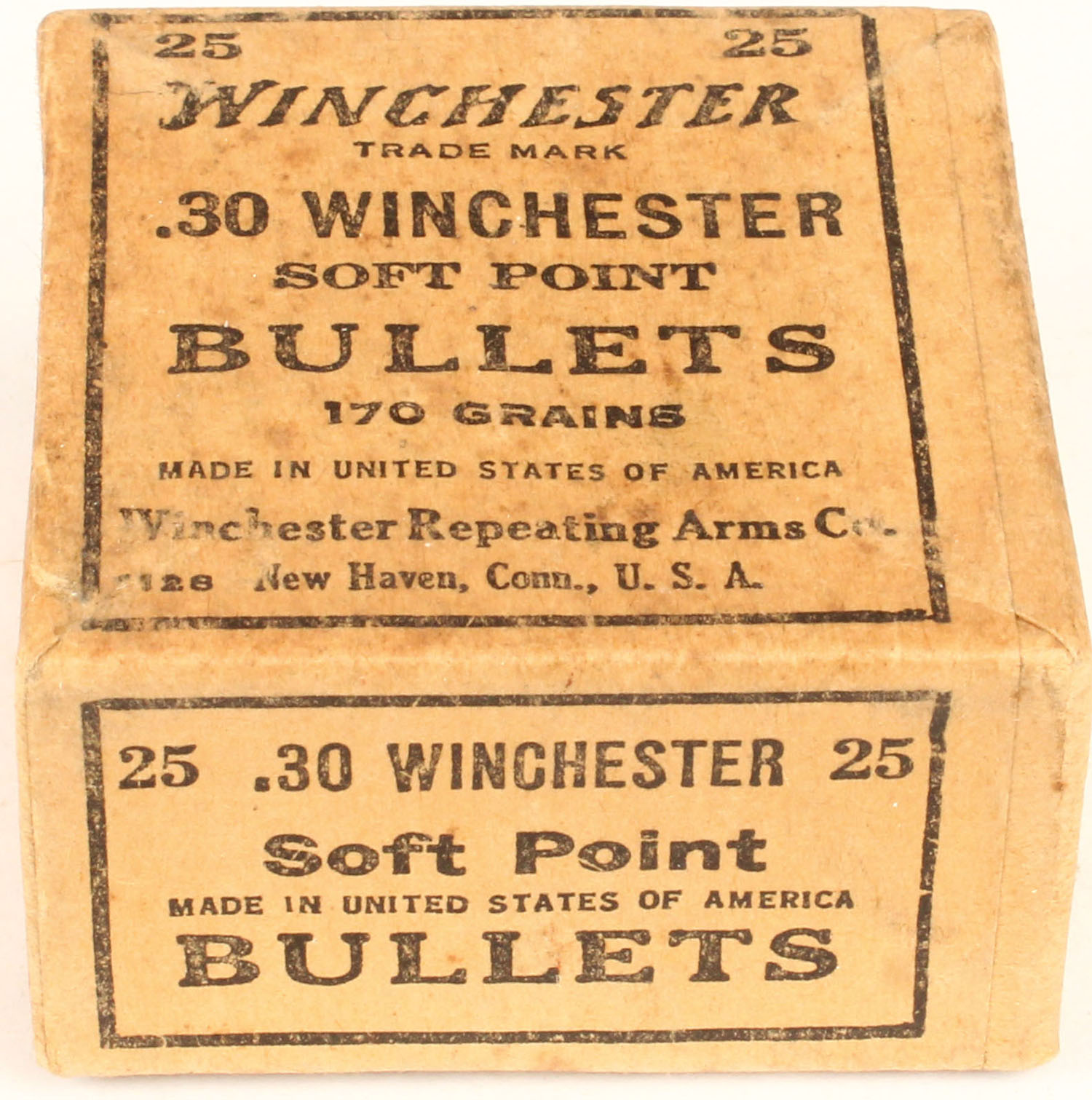 Winchester, 30 Win, 170 Grs., Soft Point Bullets, Full, 2pc. Buff box with buff label, box is very solid, has light soiling with very nice colors, Bullets are excellent. Grade: Excellent - Value: 10 to 30