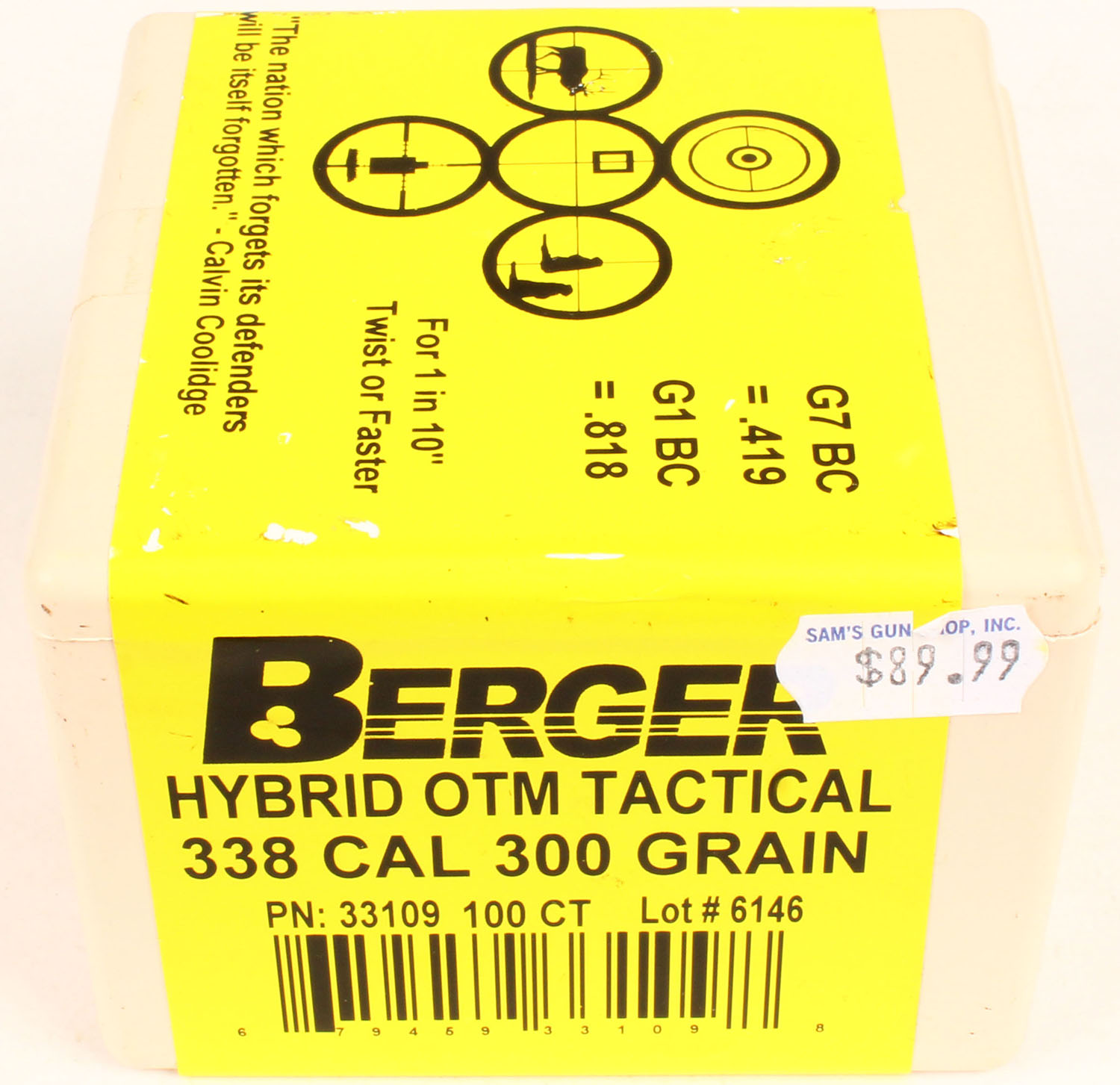 Berger, Hybrid OTM Tactical, .338 Cal. 300 GR., FULL & SEALED 1pc. Tan plastic box, box is MINT with minty color. Grade: MINT - Value: 20 to 100